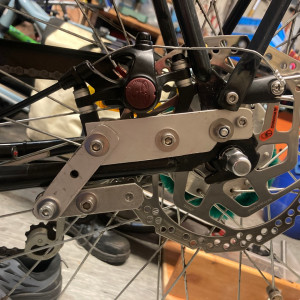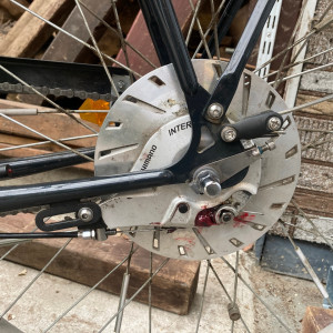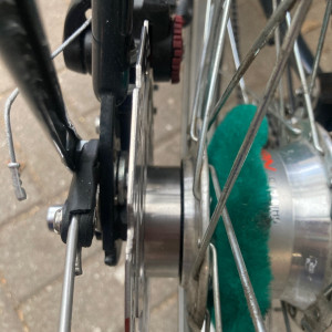 Ich konnte den Bremssattel gut einstellen das er nicht schleift. Soweit zieht die Bremse gut und muß jetzt eingebremst und dann nachgestellt werden. Auf der rechten Seite wurde ein alter Umwerfer als Kettenspanner verbaut, die Kette kann ja nun nicht mehr über ihre horizontale Naben-Position gespannt werden.