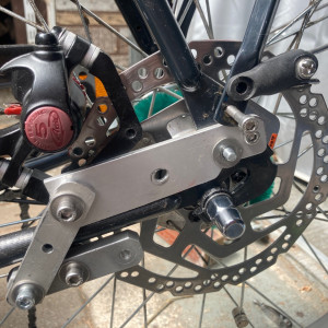 Die ganze Halterung ist nun nicht mehr innen im Rahmen verschraubt sondern außen. Ich hatte wirklich Glück das der Bremssattel trotzdem genau passte. Am Rahmen gab es ja noch die angeschweißte Halterung der Drehmomentstütze der Rollenbremse. Alle Teile der Halterung sind nun fest mit dem Rahmen verschraubt. Der kann sich nun nicht mehr bewegen.
