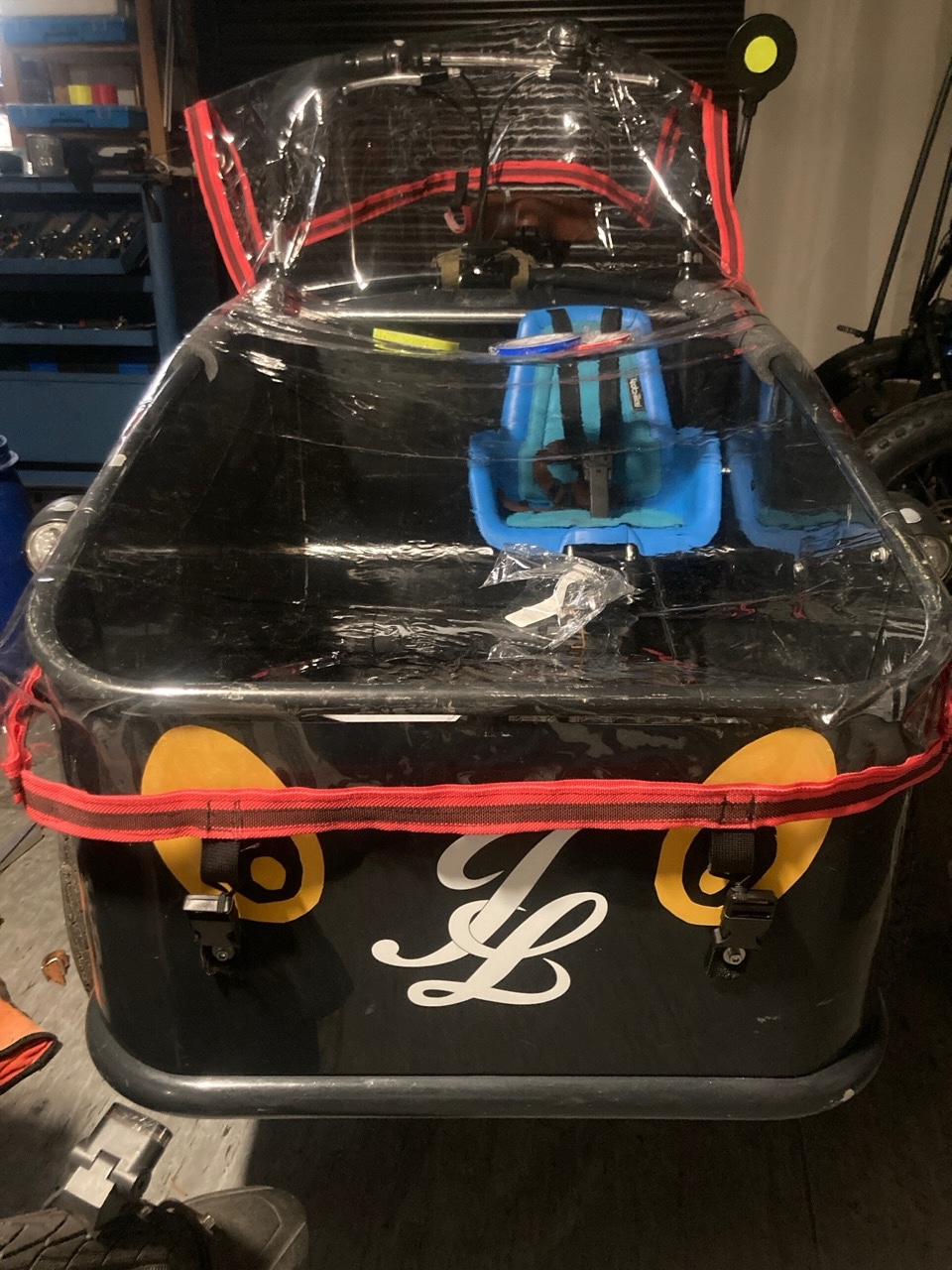 Ein Sitz für den ganz kleinen Zwerg und auch die Sitzbank (Hängematte) wurden etwas angepasst damit es zueinander passt. Eine Isomatte und ein paar Heizungsrohr Verkleidungen macht es bequemer für die Mitfahrer.