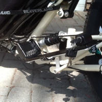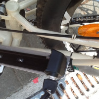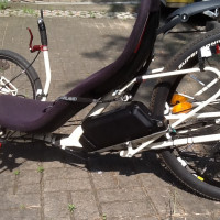 Da mein W1 weiß ist konnte ich mir mit zwei weißen Winkeln aus dem Baumarkt die für Balkonblumenkästen vorgesehen sind gut weiterhelfen. Ein Aluwinkelblech als Auflage unten, das wars schon. Das Alu-Winkelblech liegt hinten auf dem Packtaschenhalter nur auf, Ein Winkel wurde unten am Packtaschen-Halter angeschraubt als mittlere Stütze und der zweite Winkel wurde an der freien Halterung vom Stoßdämpfer mit einer langen Schraube durch beide Löcher befestigt. Natürlich ist der Zwischenraum am Stoßdämpferhalter mit einem Spacer gesichert. Ich habe zuerst meiner Halterung nicht so ganz getraut und habe den Akku zusätzlich gegen die Auftretenden Seitenkräfte mit einem Band gesichert. Aber ich habe jetzt beim Fahren gemerkt der sitzt total fest und ruhig da hinter mir. Der genießt die total geile Vorder-Hinterradfederung vom Steintrike. Die Settings kann man hier sehen.