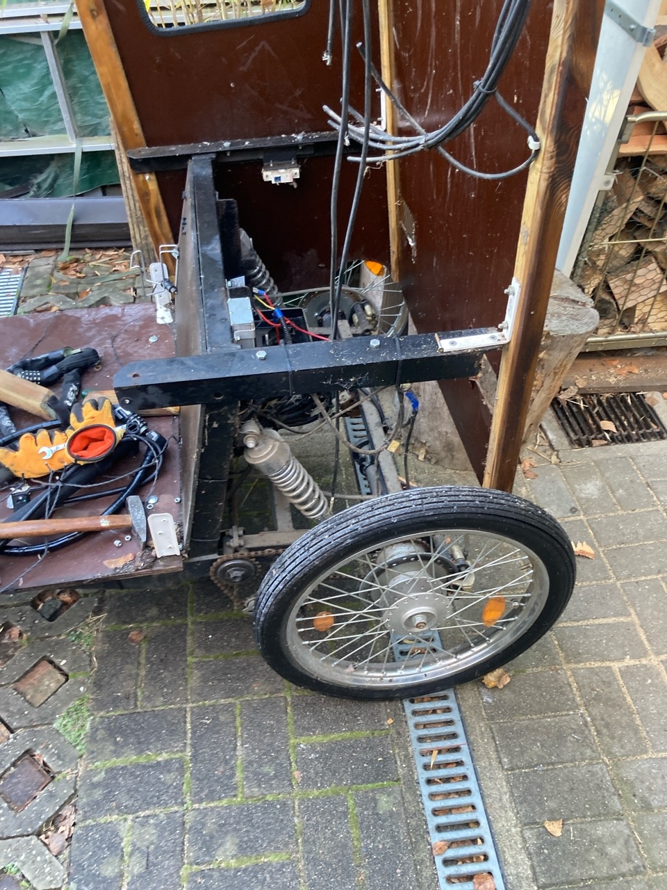 Das Trike also kurzerhand hinten aufgebockt, um es zu testen. Der Gasgriff lässt den rechten Reifen in „Schrittgeschwindigkeit“ laufen.