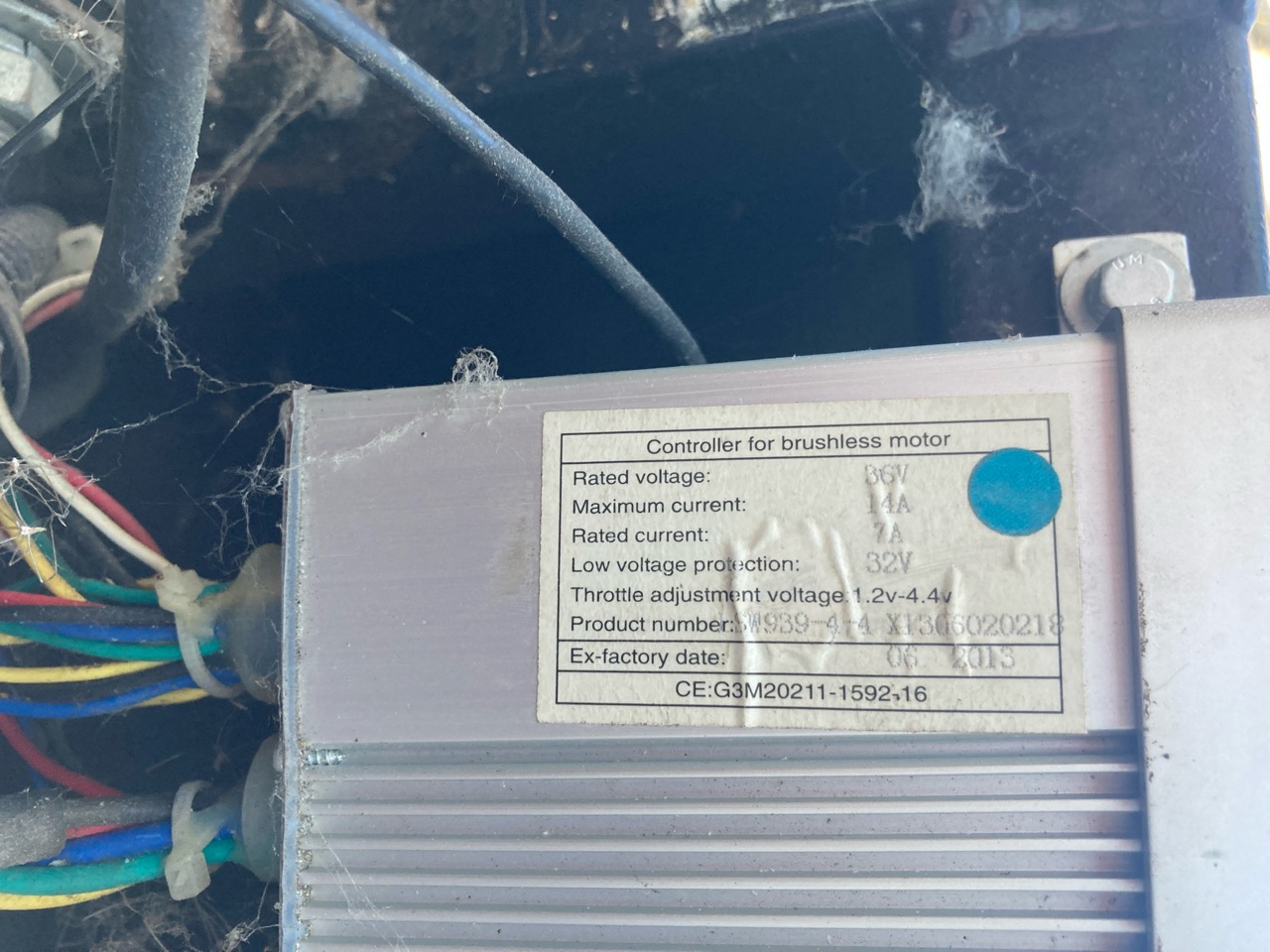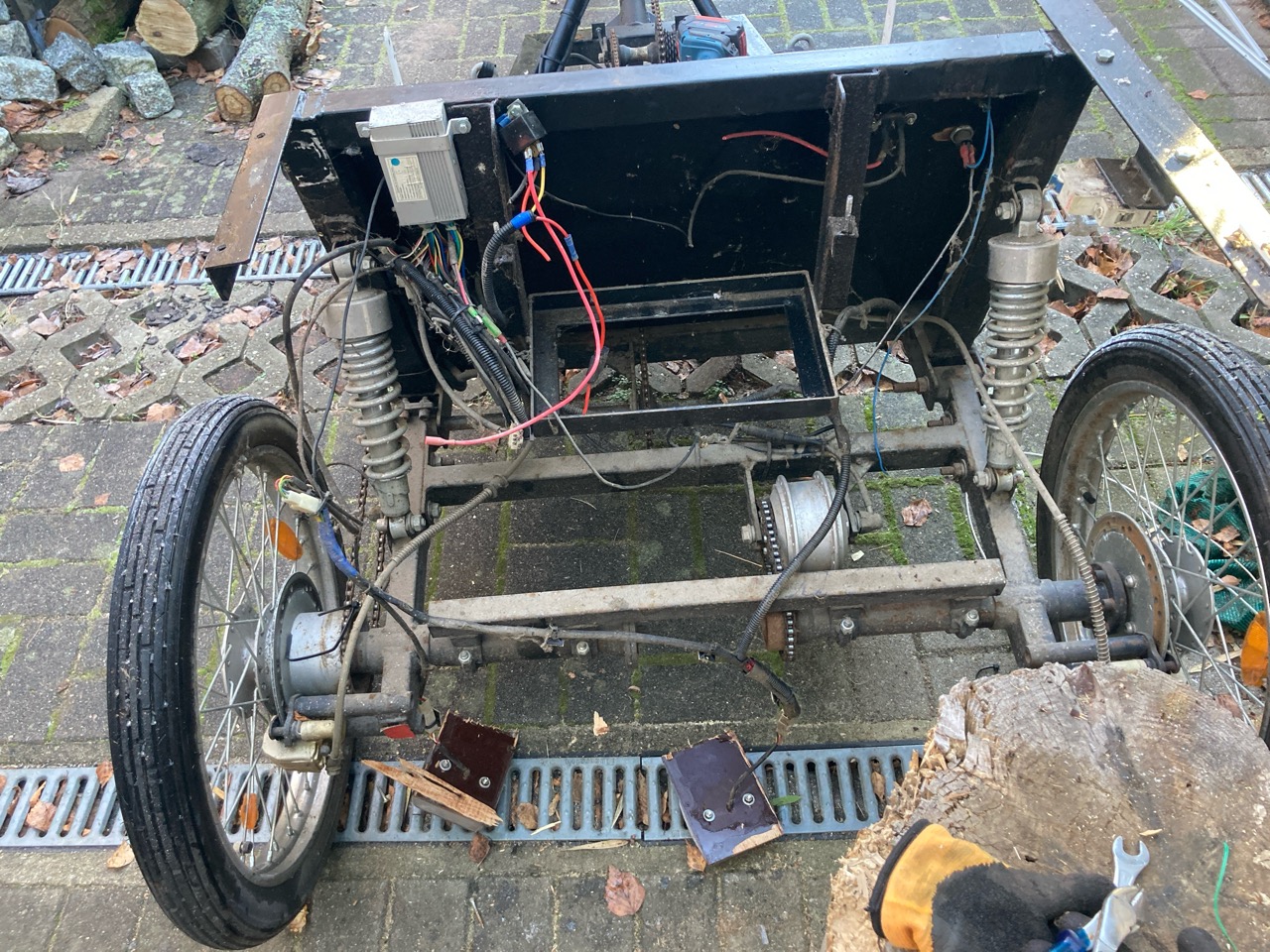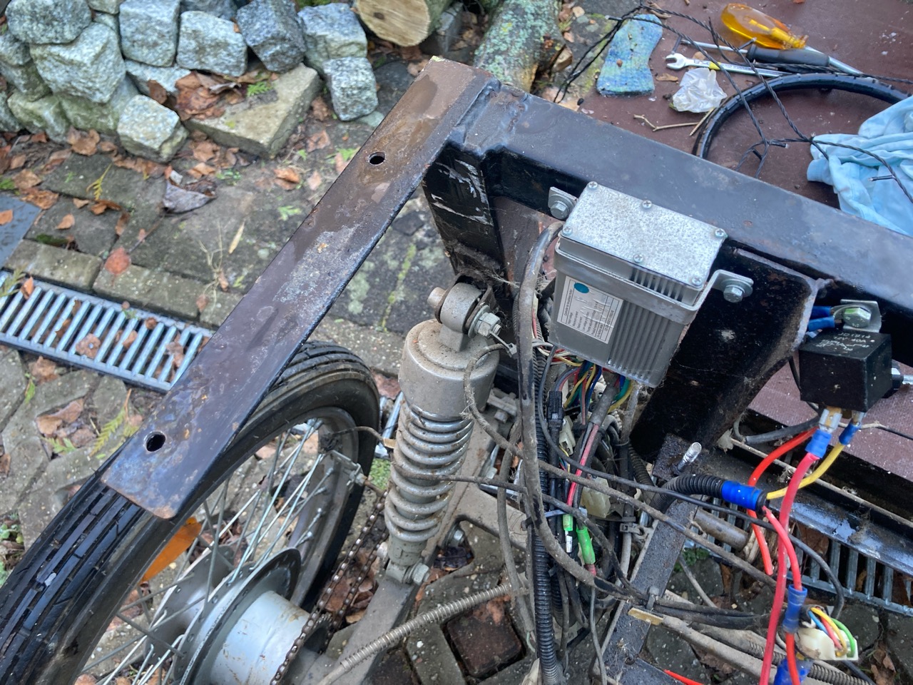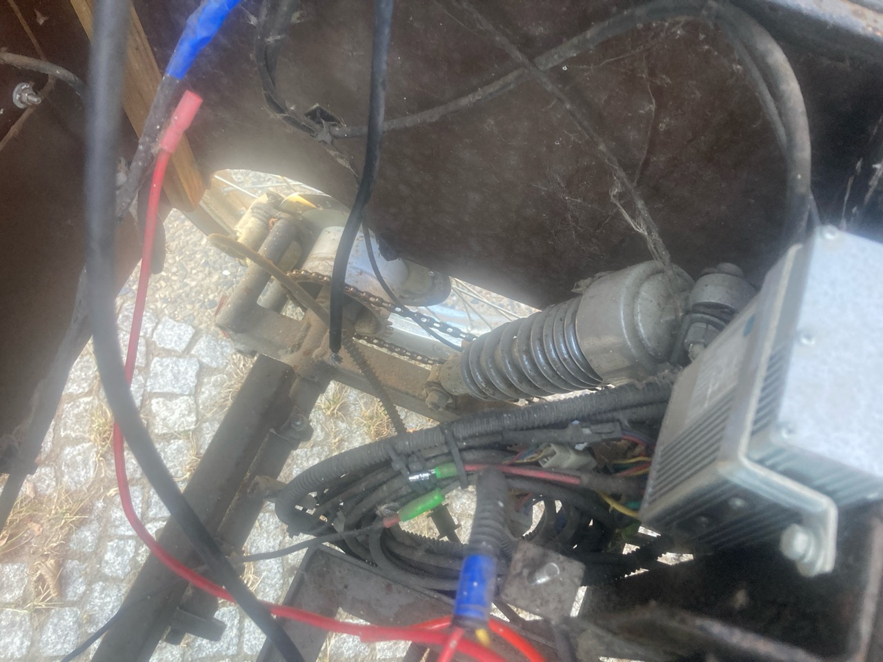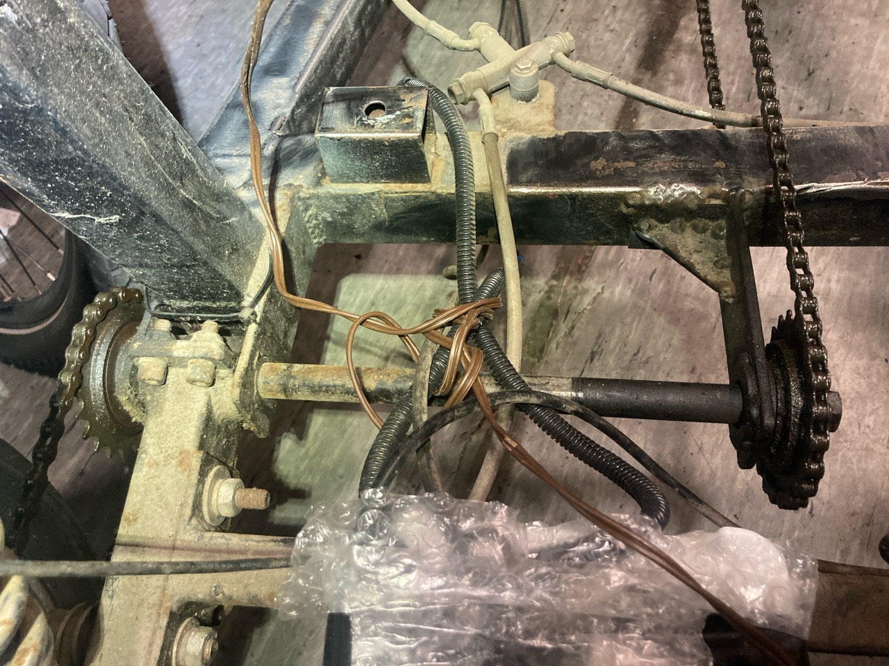 Das Gefährt ist hinten gefedert, und die Federung scheint auch noch zu funktionieren. Die Akkus sind nicht vorhanden, dafür gibt es jede Menge abgeschnittener Kabel. Die Kette, die von vorne kommt, bedient nur das linke Hinterrad. Das rechte Hinterrad besitzt einen eigenen Motor, der seine Kraft über eine kleine Kette auf selbiges überträgt. Einen Controller habe ich auch gefunden. Er ist für einen Brushless-Motor mit 36 V. Das ist ja mal ein vielversprechender Anfang. Ein Display und ein Gasgriff sind am Lenker verbaut. Das Tretlager besitzt eine PAS-Scheibe für den Controller. Vielleicht geht ja da noch was.