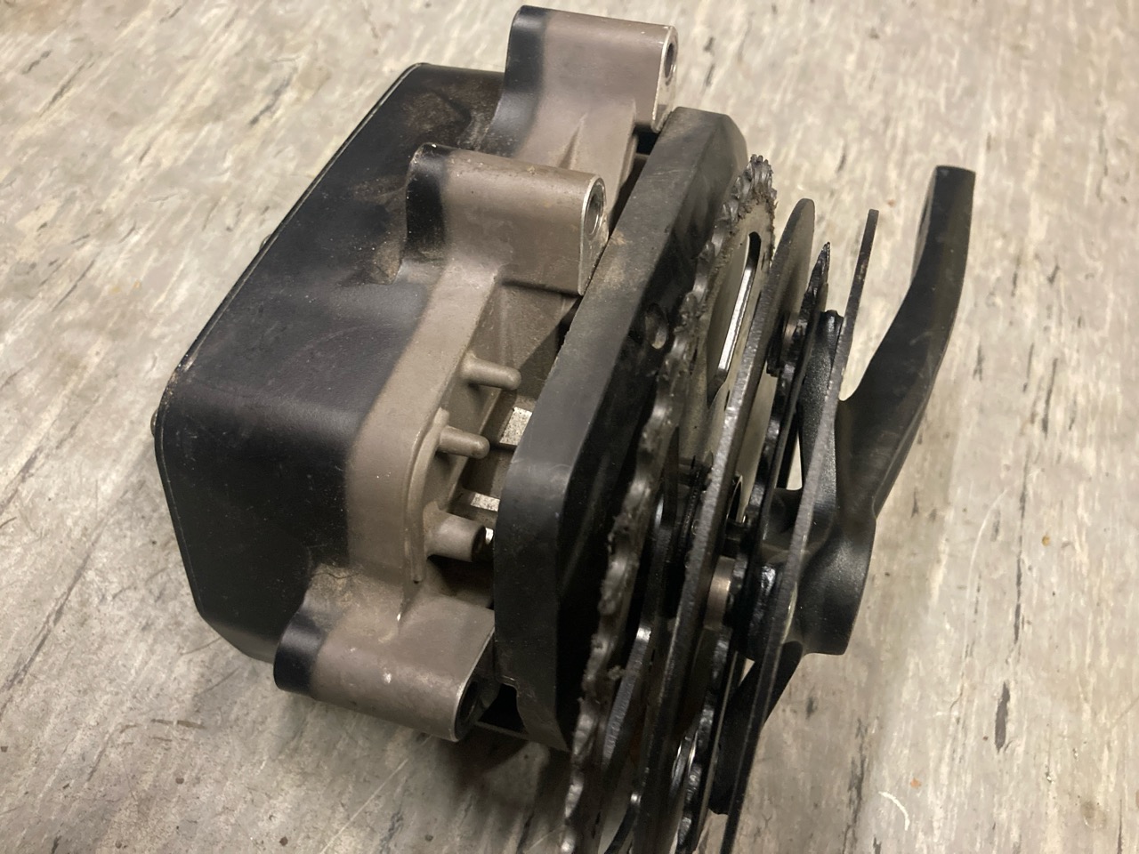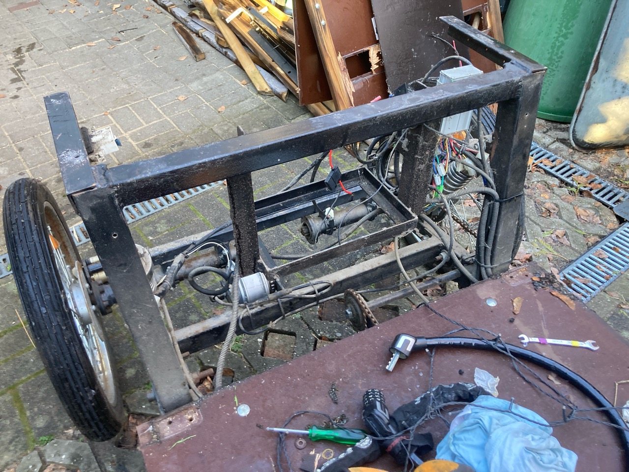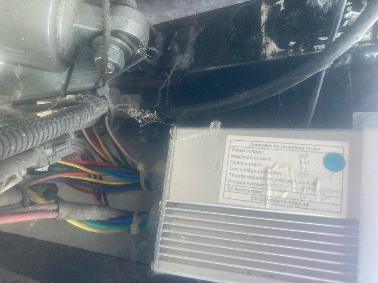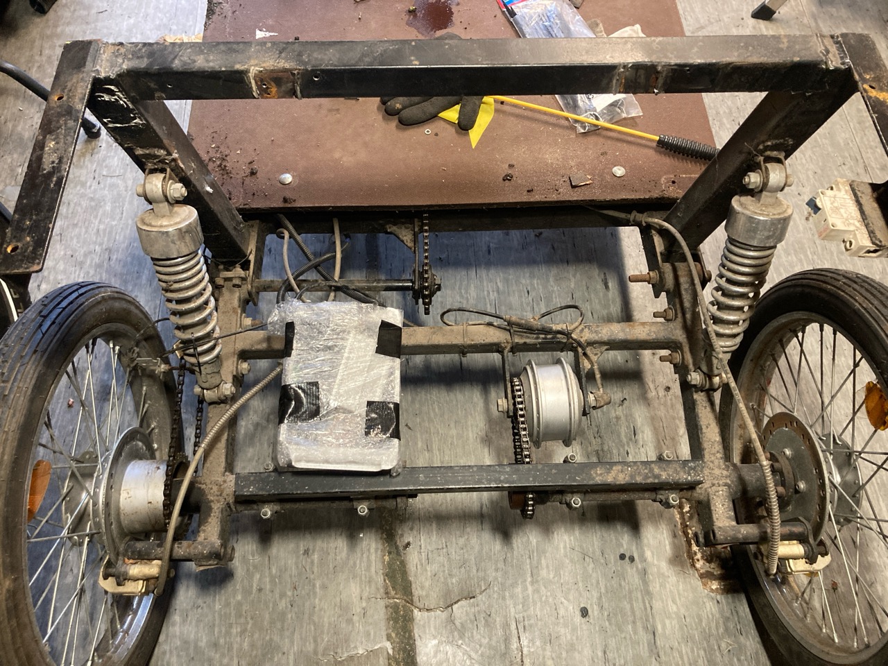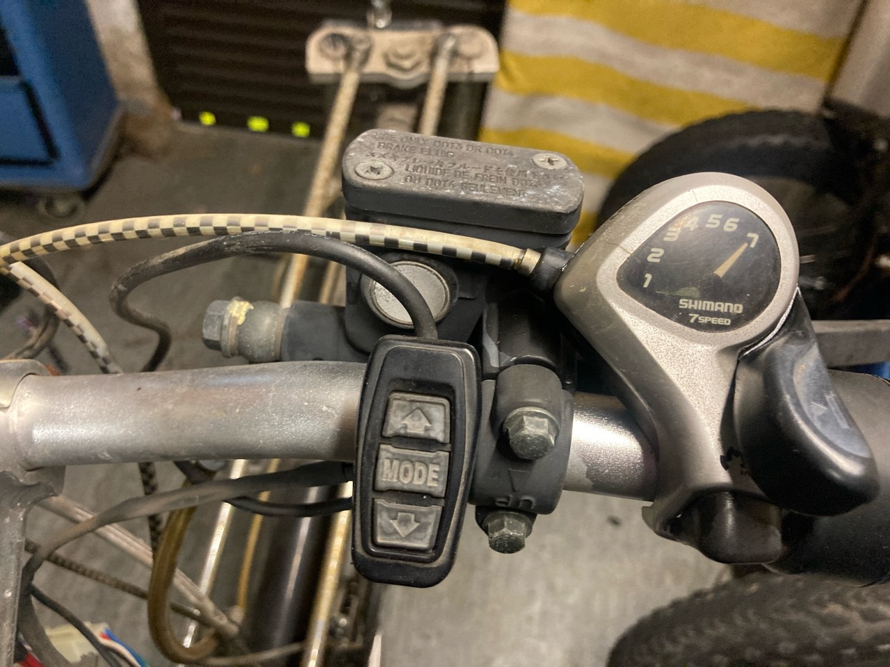 Das Gefährt ist hinten gefedert, und die Federung scheint auch noch zu funktionieren. Die Akkus sind nicht vorhanden, dafür gibt es jede Menge abgeschnittener Kabel. Die Kette, die von vorne kommt, bedient nur das linke Hinterrad. Das rechte Hinterrad besitzt einen eigenen Motor, der seine Kraft über eine kleine Kette auf selbiges überträgt. Einen Controller habe ich auch gefunden. Er ist für einen Brushless-Motor mit 36 V. Das ist ja mal ein vielversprechender Anfang. Ein Display und ein Gasgriff sind am Lenker verbaut. Das Tretlager besitzt eine PAS-Scheibe für den Controller. Vielleicht geht ja da noch was.
