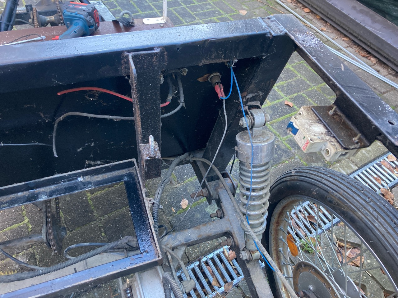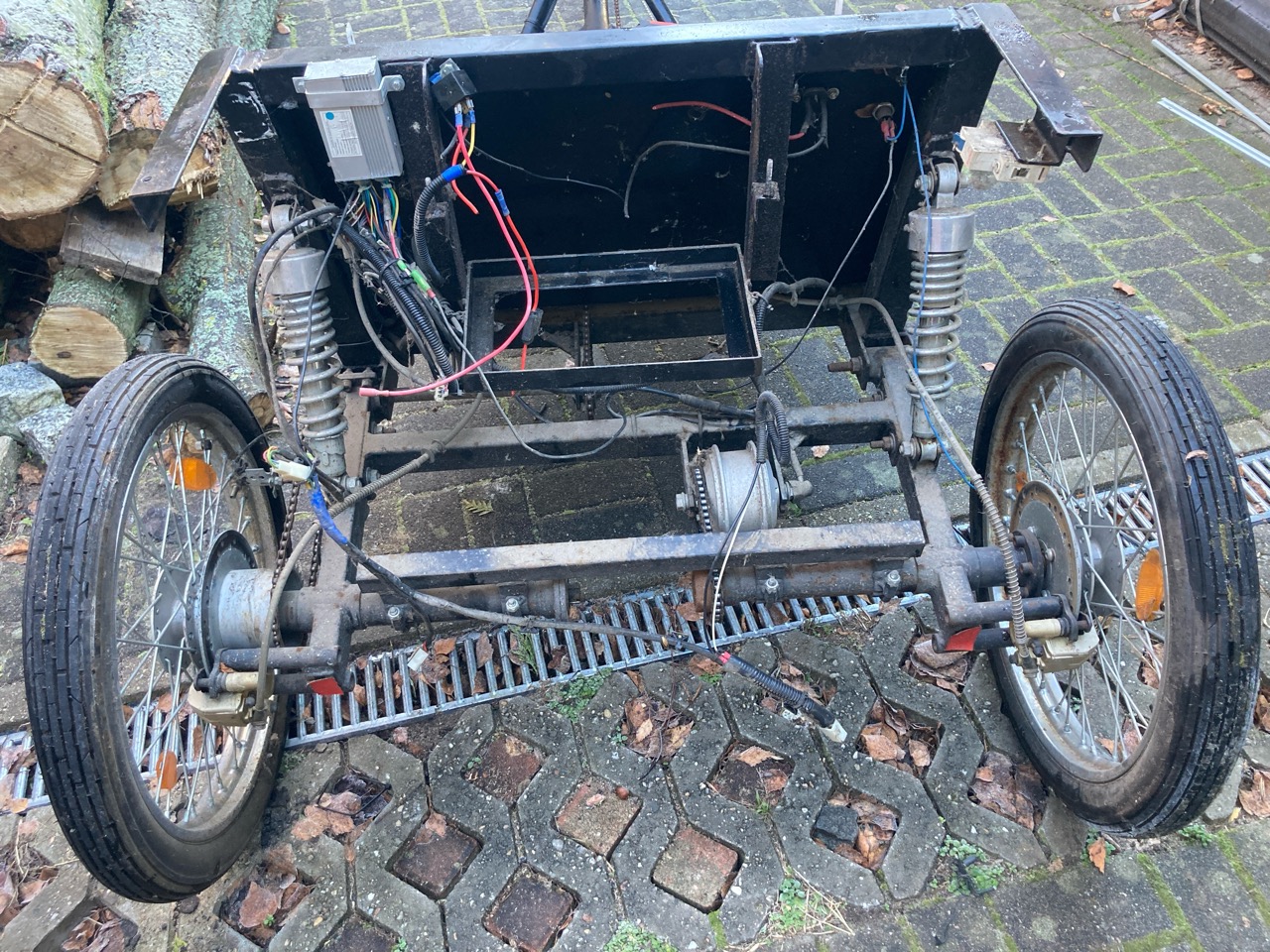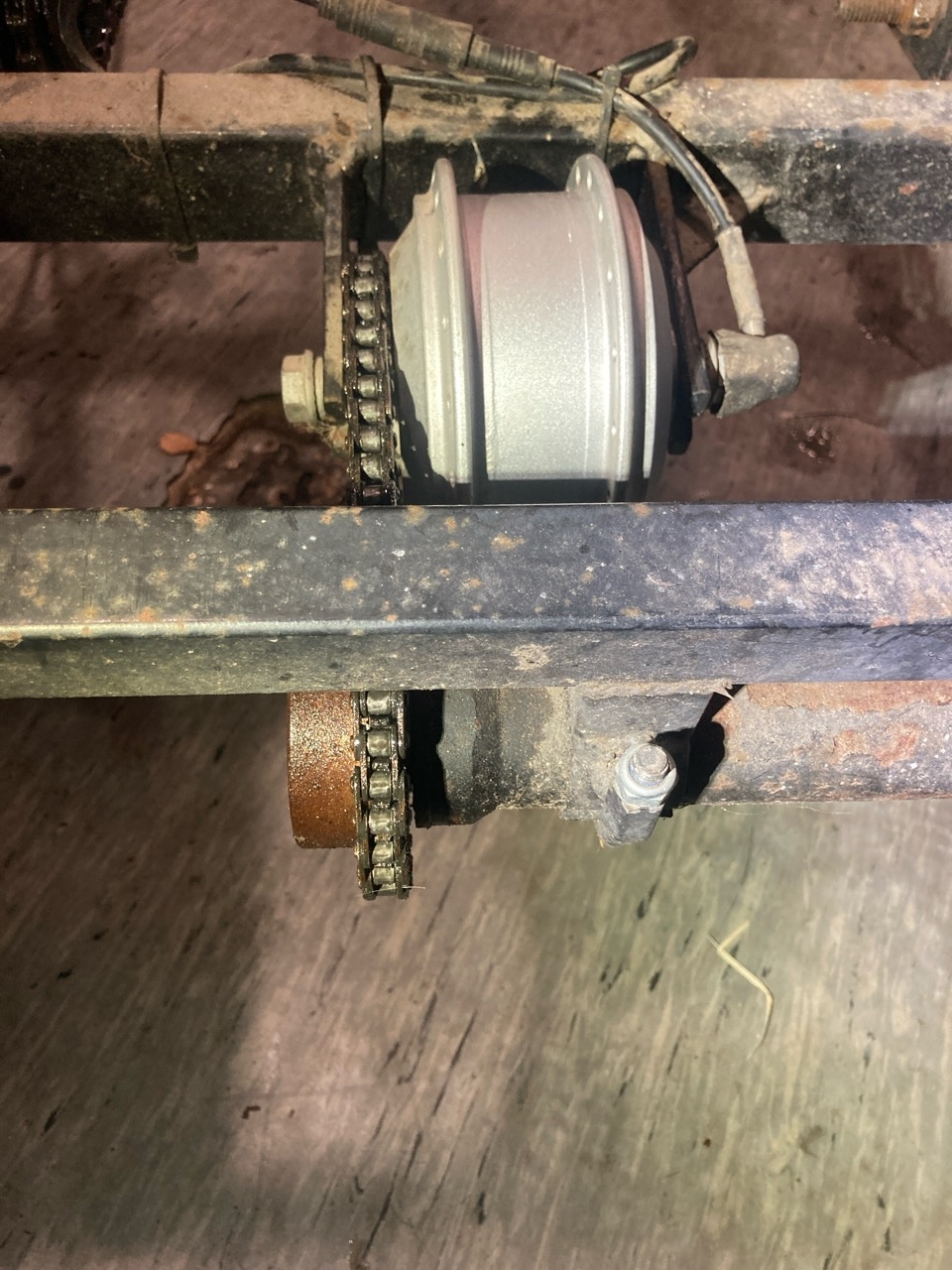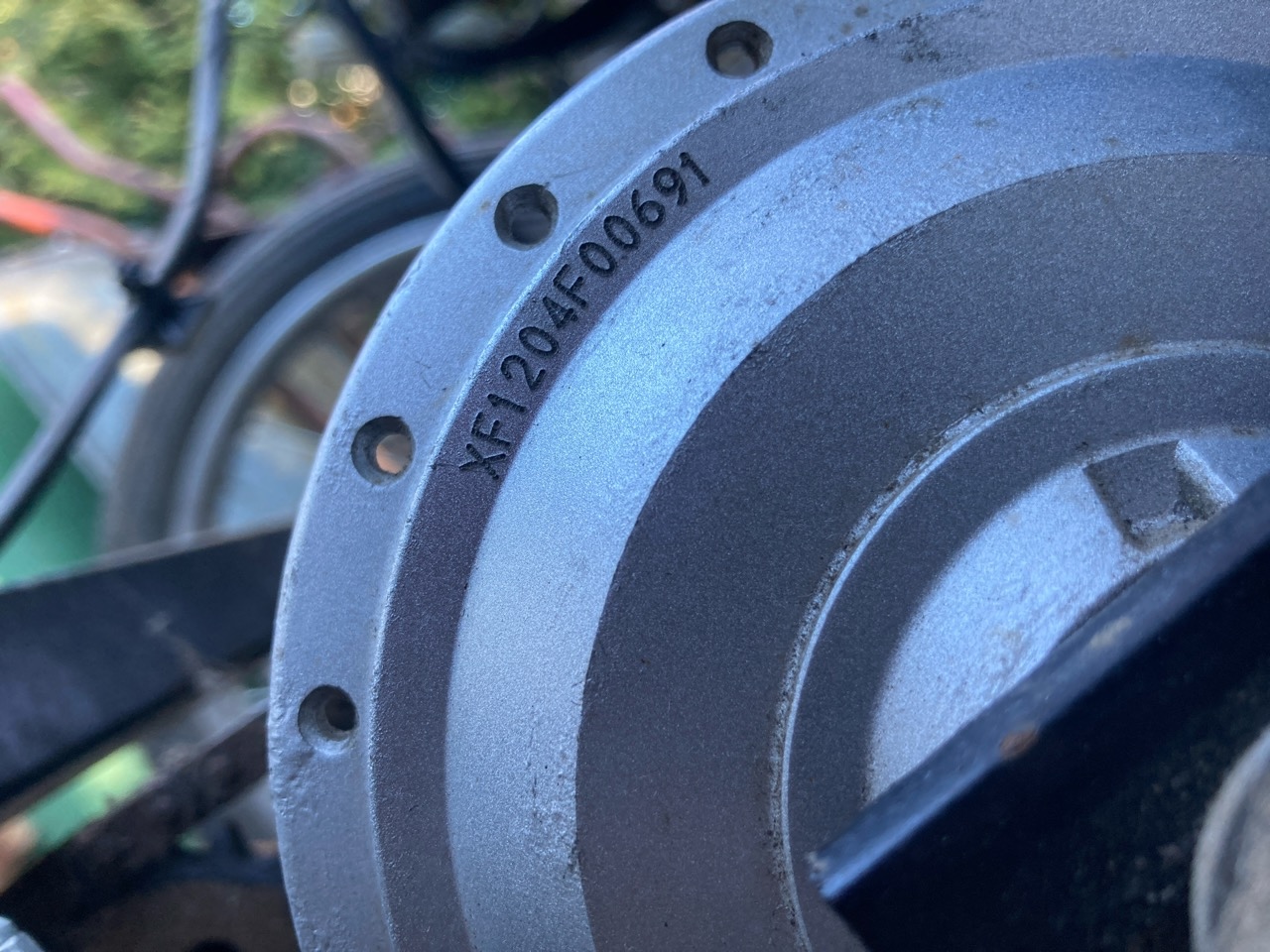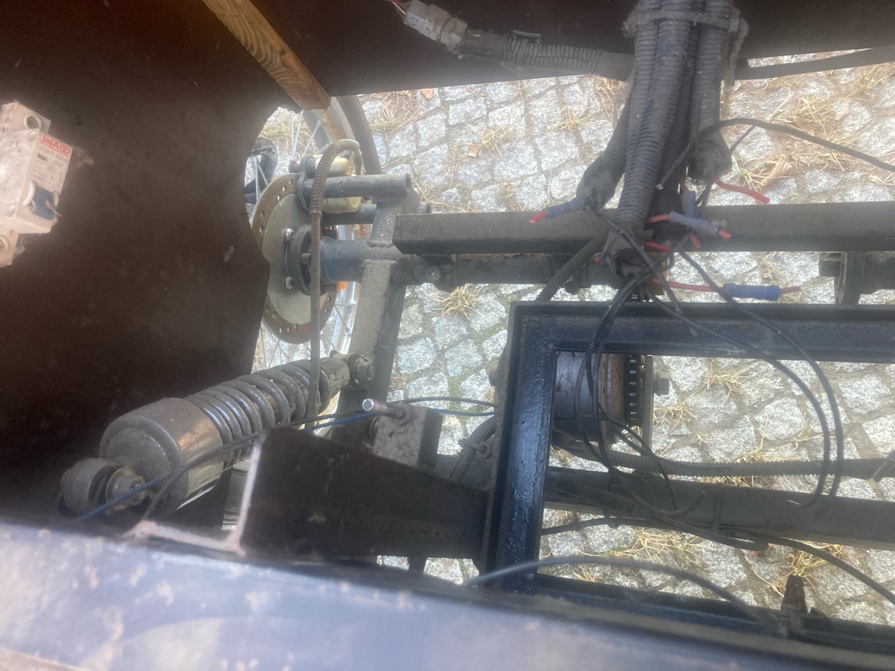Das Gefährt ist hinten gefedert, und die Federung scheint auch noch zu funktionieren. Die Akkus sind nicht vorhanden, dafür gibt es jede Menge abgeschnittener Kabel. Die Kette, die von vorne kommt, bedient nur das linke Hinterrad. Das rechte Hinterrad besitzt einen eigenen Motor, der seine Kraft über eine kleine Kette auf selbiges überträgt. Einen Controller habe ich auch gefunden. Er ist für einen Brushless-Motor mit 36 V. Das ist ja mal ein vielversprechender Anfang. Ein Display und ein Gasgriff sind am Lenker verbaut. Das Tretlager besitzt eine PAS-Scheibe für den Controller. Vielleicht geht ja da noch was.