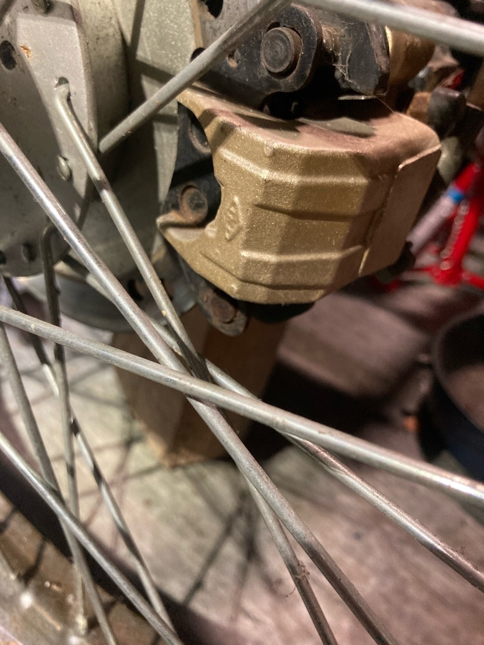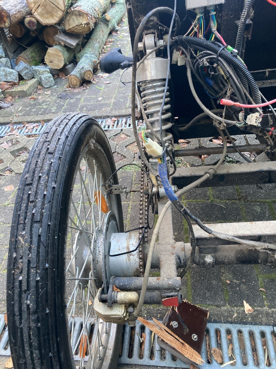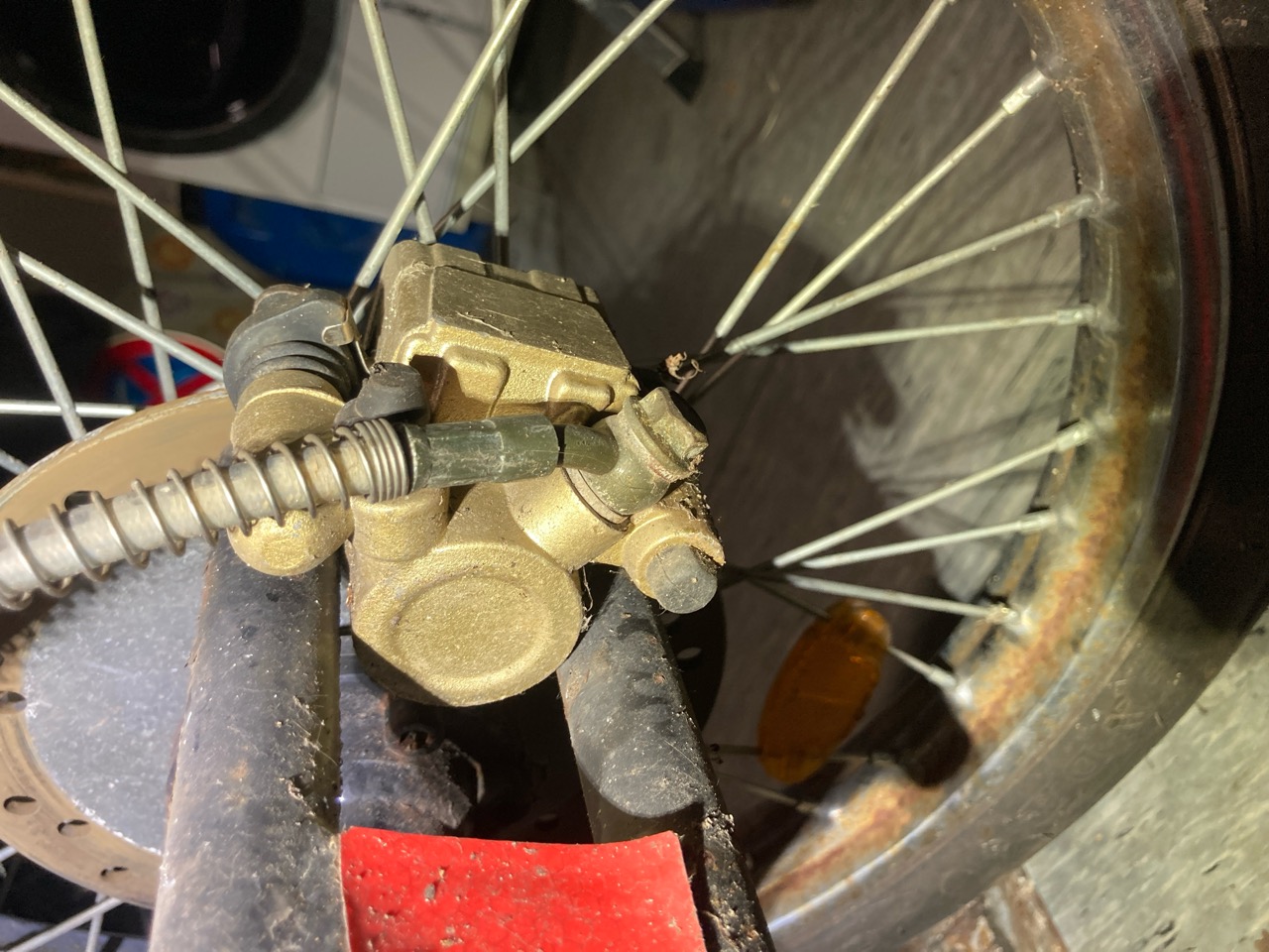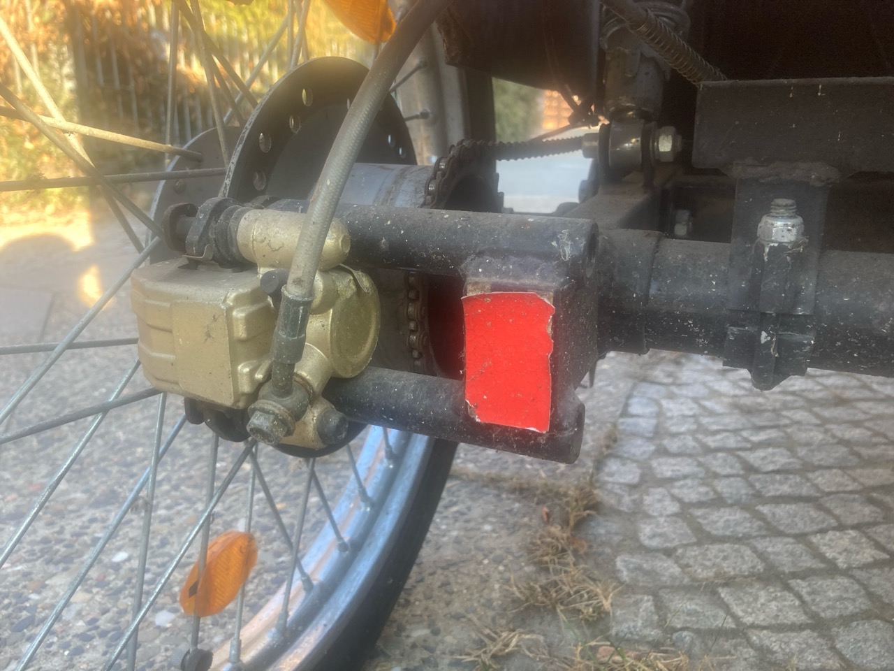 Hier gibt es Ersatz, falls nötig. Der Bremssattel stammt von einem Roller, der direkt am Motor hinten links angebaut ist. Sieht passend aus.
