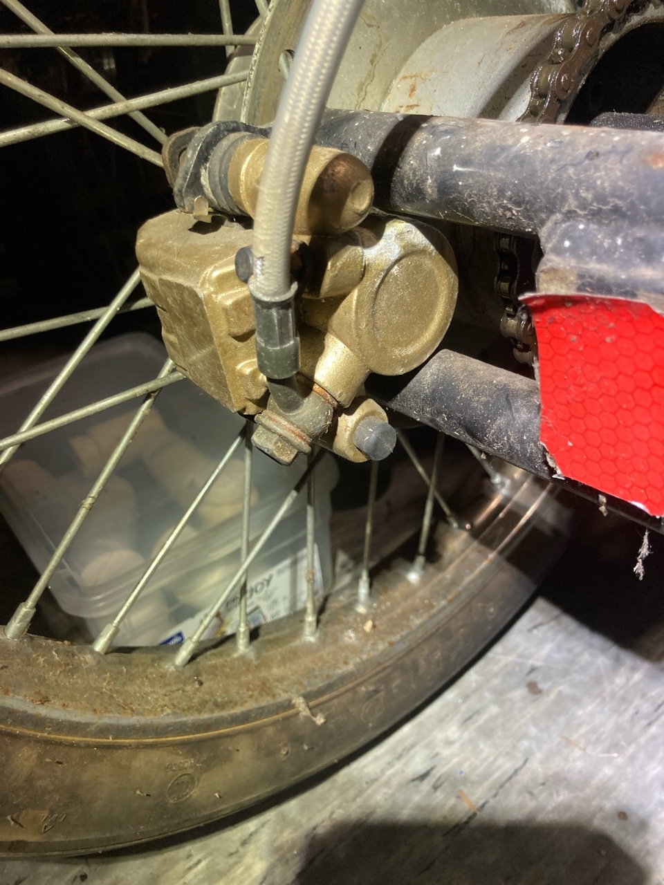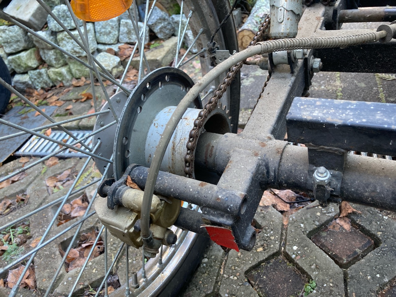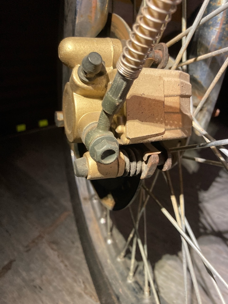 Hier gibt es Ersatz, falls nötig. Der Bremssattel stammt von einem Roller, der direkt am Motor hinten links angebaut ist. Sieht passend aus.