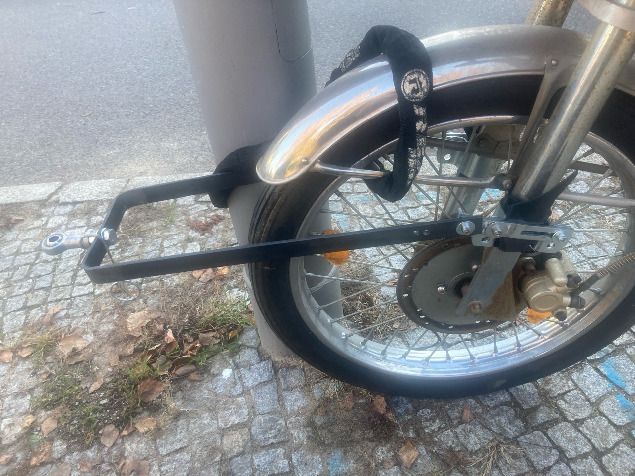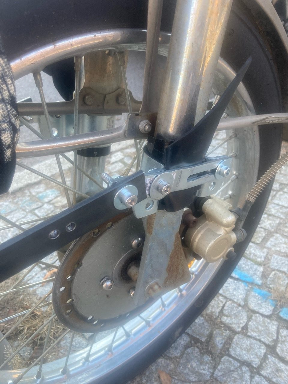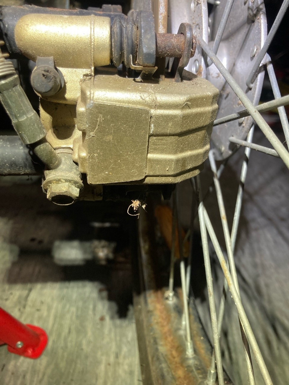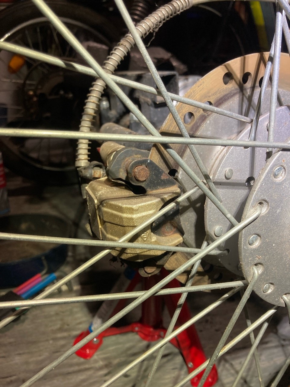 Hier gibt es Ersatz, falls nötig. Der Bremssattel stammt von einem Roller, der direkt am Motor hinten links angebaut ist. Sieht passend aus.
