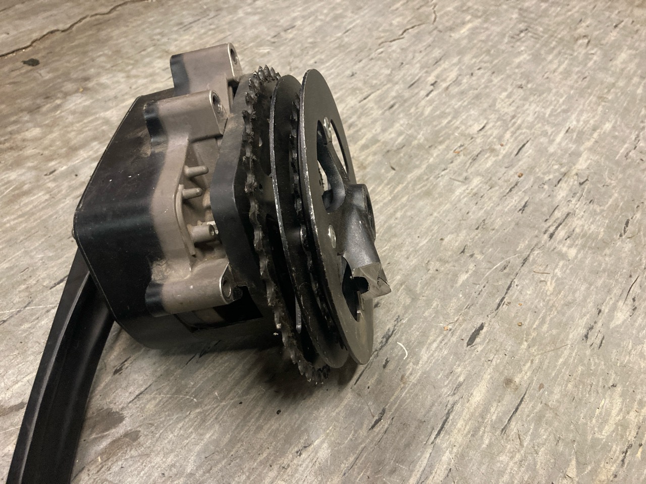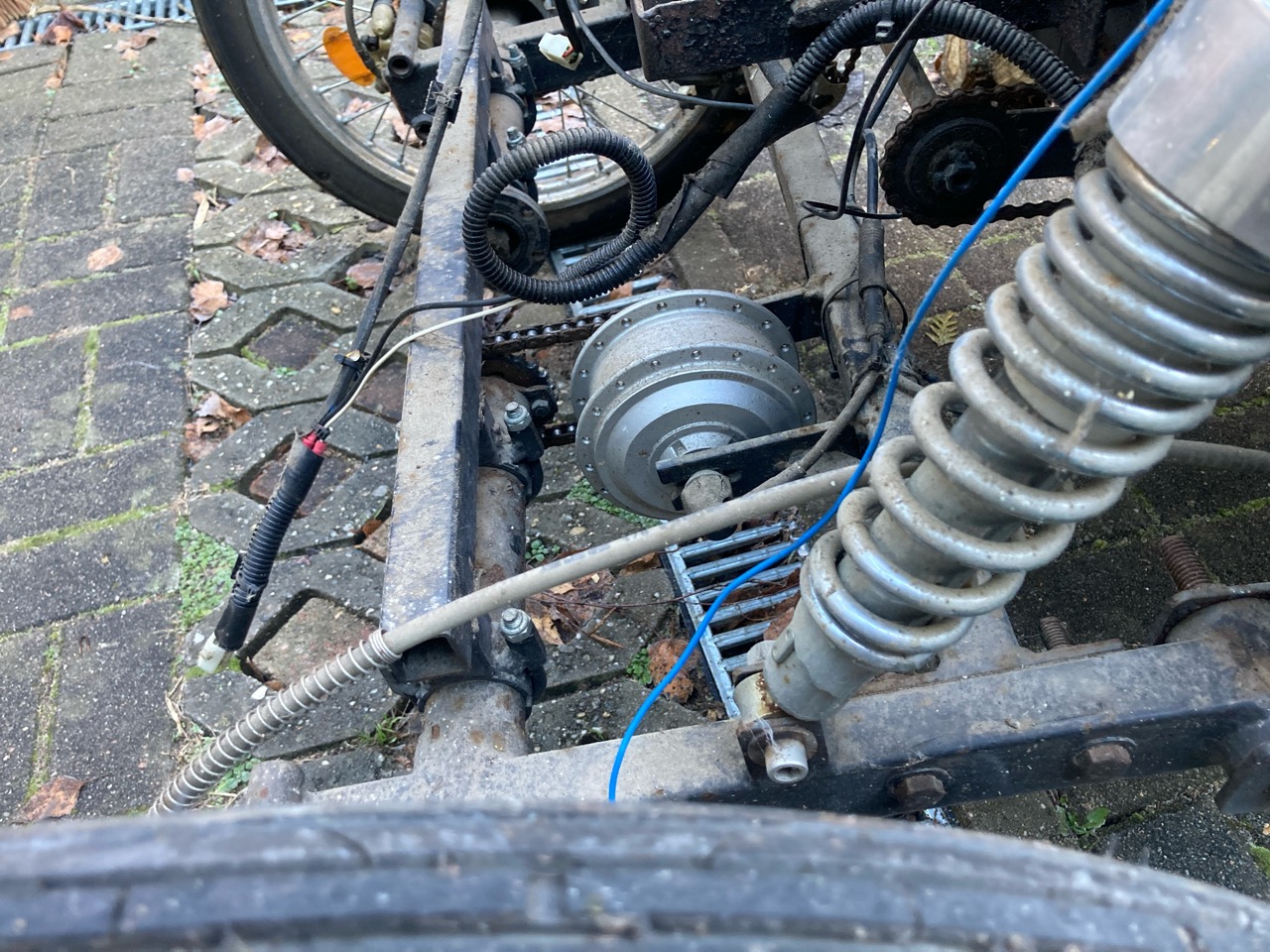 Auf der rechten Seite in der Schwinge wurde ein Vorderradmotor eingebaut. Dieser hat ein recht breites Ritzel auf der Scheibenbremsaufnahme montiert bekommen.