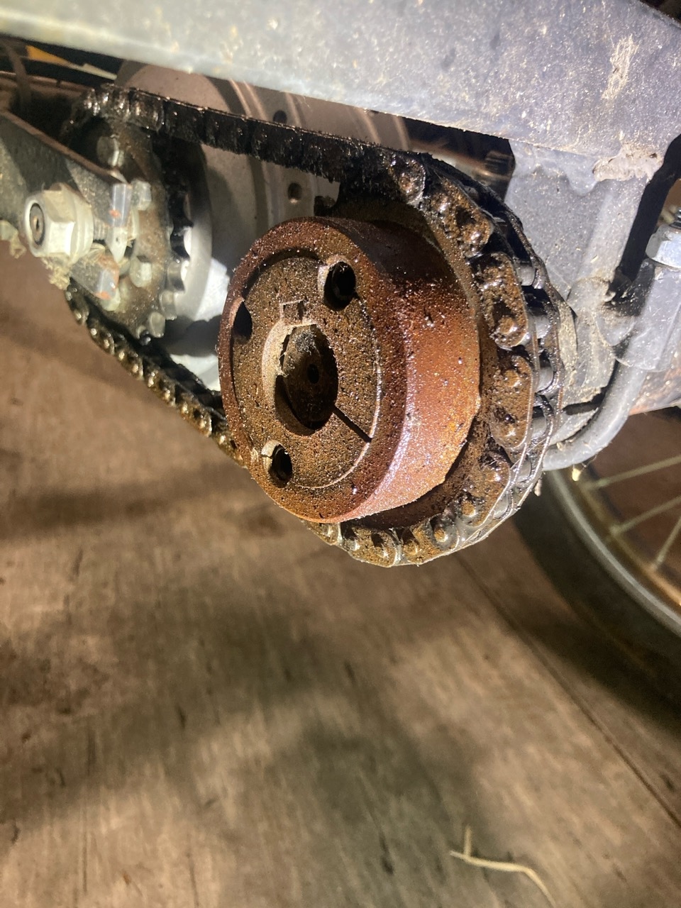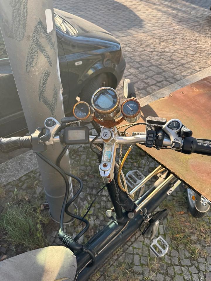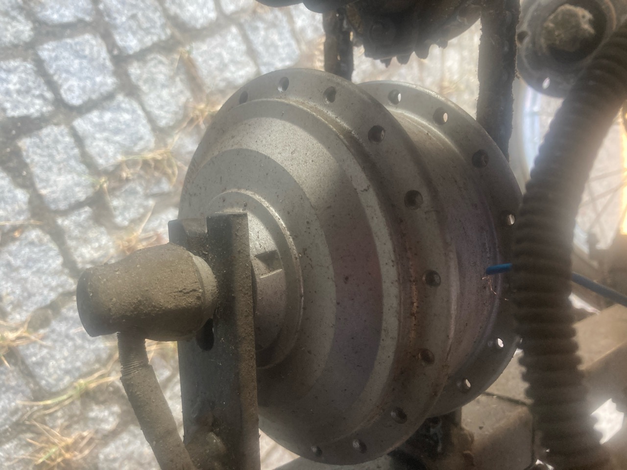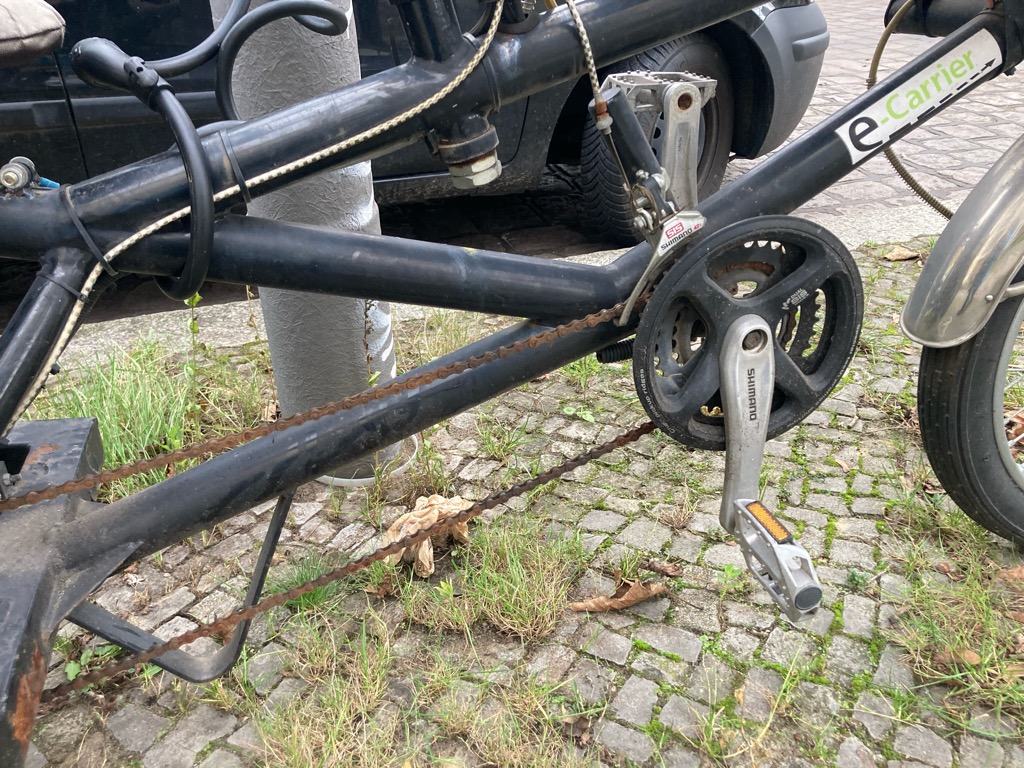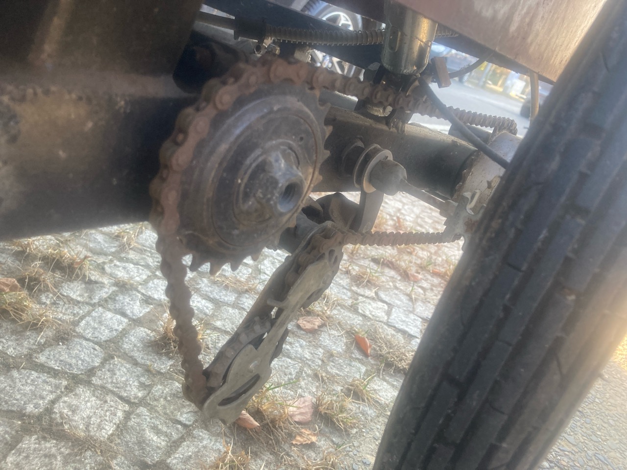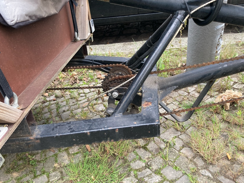 Alle Ketten sind ja noch voll rostig, die Räder drehen aber relativ leicht. Die ersten Meter ist es auch mit dem Bioantrieb gefahren – machbar, aber nicht empfehlenswert bei diesem Gewicht. Die Hydraulikbremsen taten, was sie sollten. Die Schaltung hakelt bei all dem Rost. Rückwärtstreten geht noch nicht mit dieser Kette.
