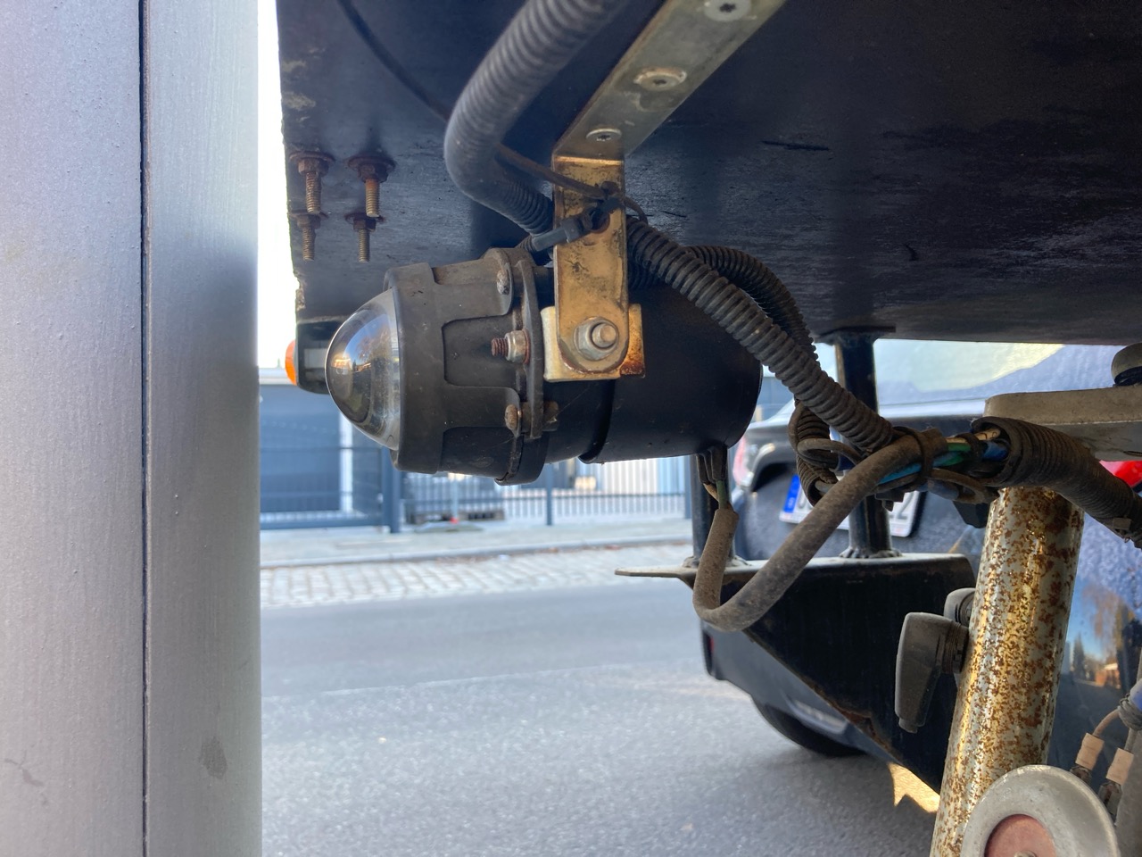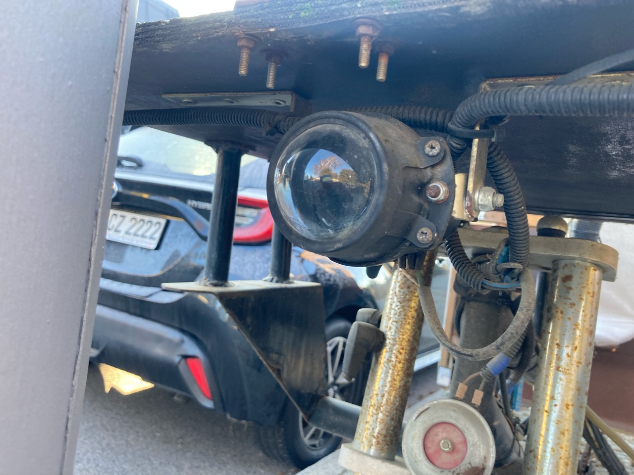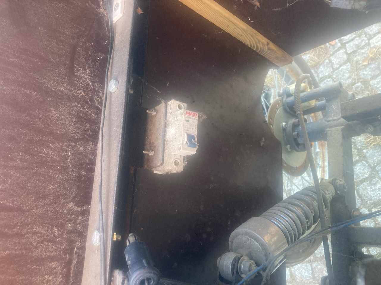 Am Vorderrad habe ich schon einmal zwei lose Schrauben gefunden, die die Bremsscheibe festhalten sollen. Die Deichsel ist ein schneller Selbstbau, der für den ersten Transport notwendig war.