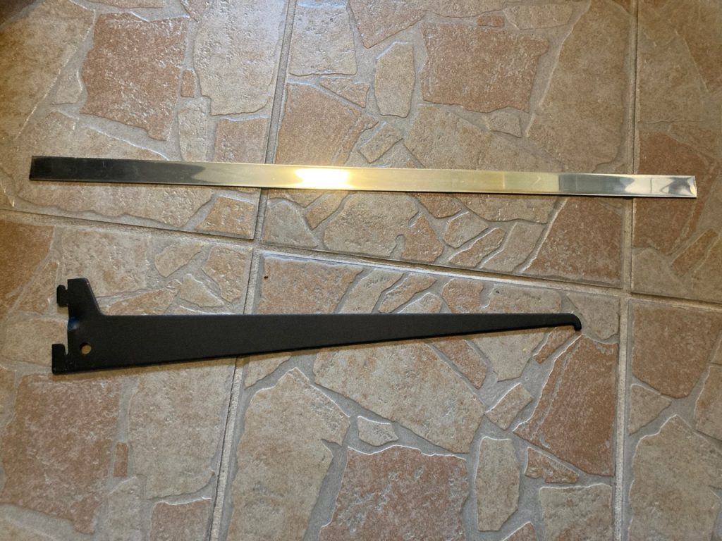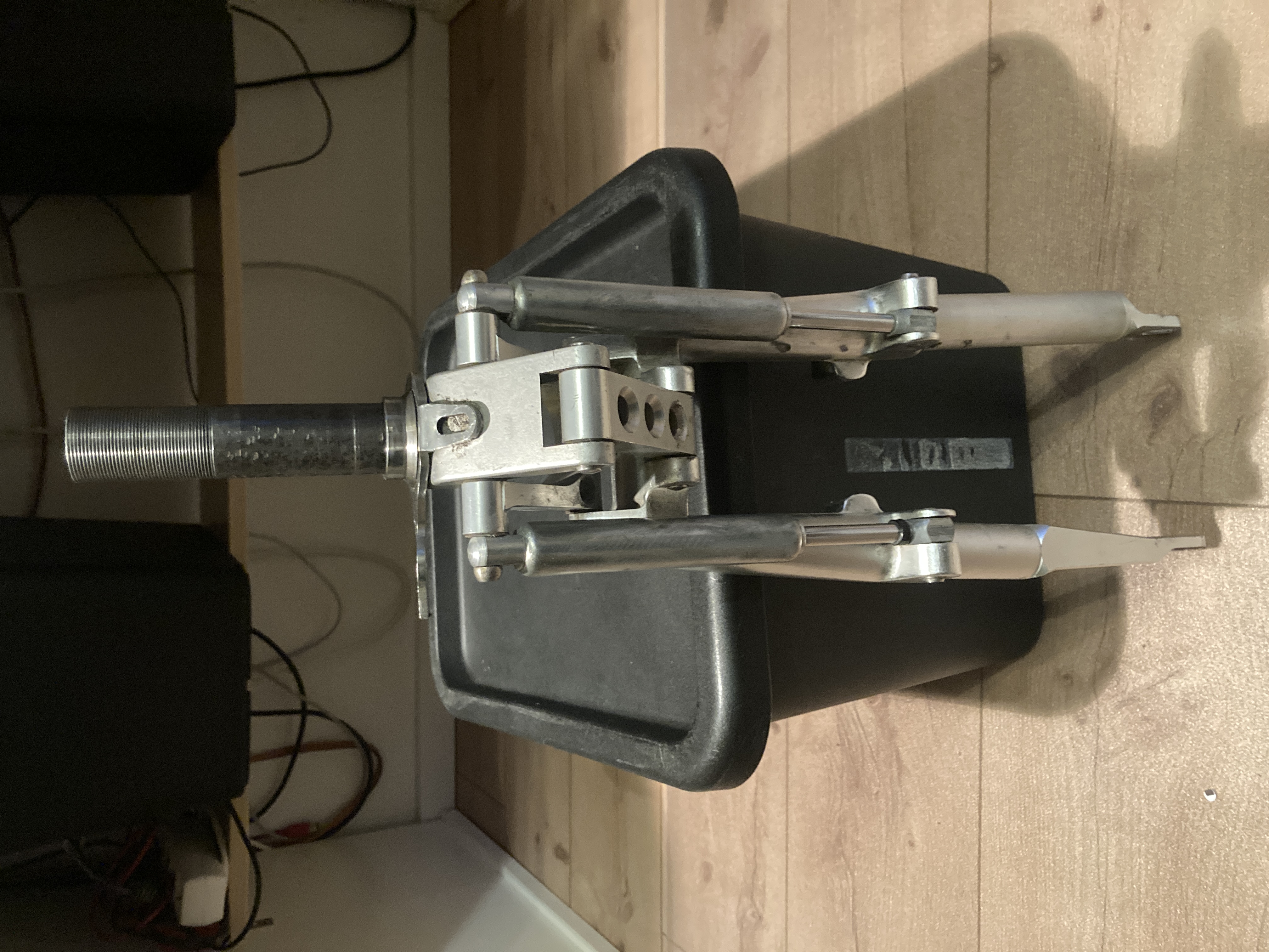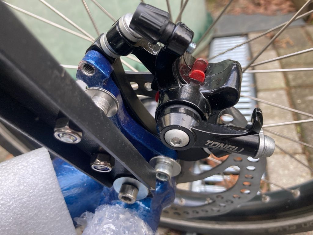 Wie immer was da ist wird auch benutzt, wurde ein Regalwinkel, etwas dünnes Edelstahlblech, eine Halterund einer alten Bremse, alte Schutzblechstreben + deren Halteschrauben benutzt. Noch nicht schön aber für den Prototyp genau das richtige.