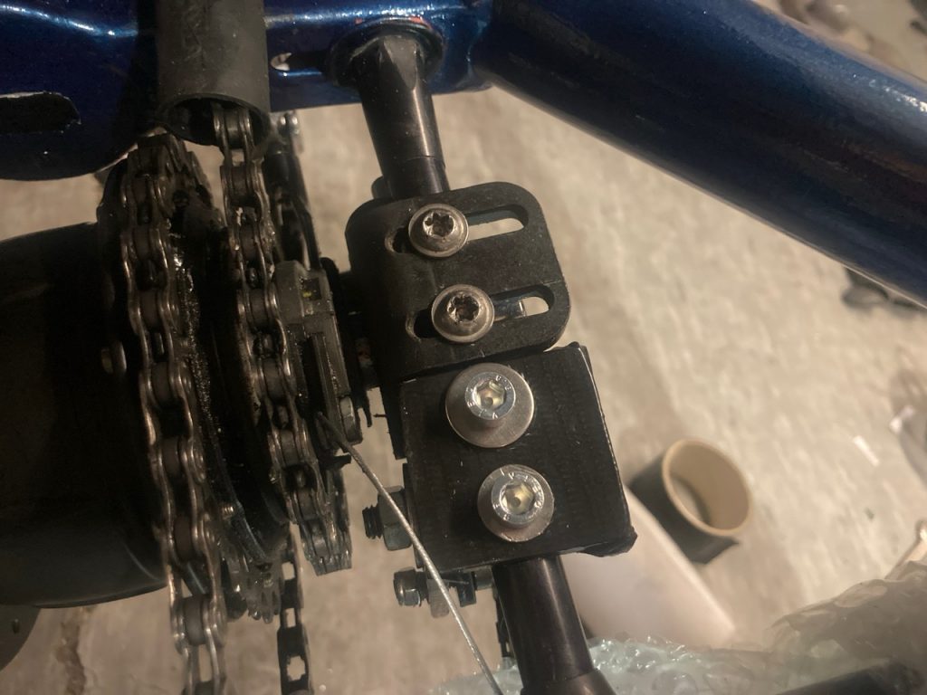 Der Kettenspanner wurde nun wirklich durch ein Schaltwerk realisiert. Hinter dem originalen Nabenhalter wurde ein zweiter angefertigt, und daran wurde der Kettenspanner befestigt. Durch das Ausziehen des Mastes kann der Kettenspanner in die gewünschte Position gebracht werden. Soweit oben wird er auch nicht in der ersten Grasnabe hängen bleiben.