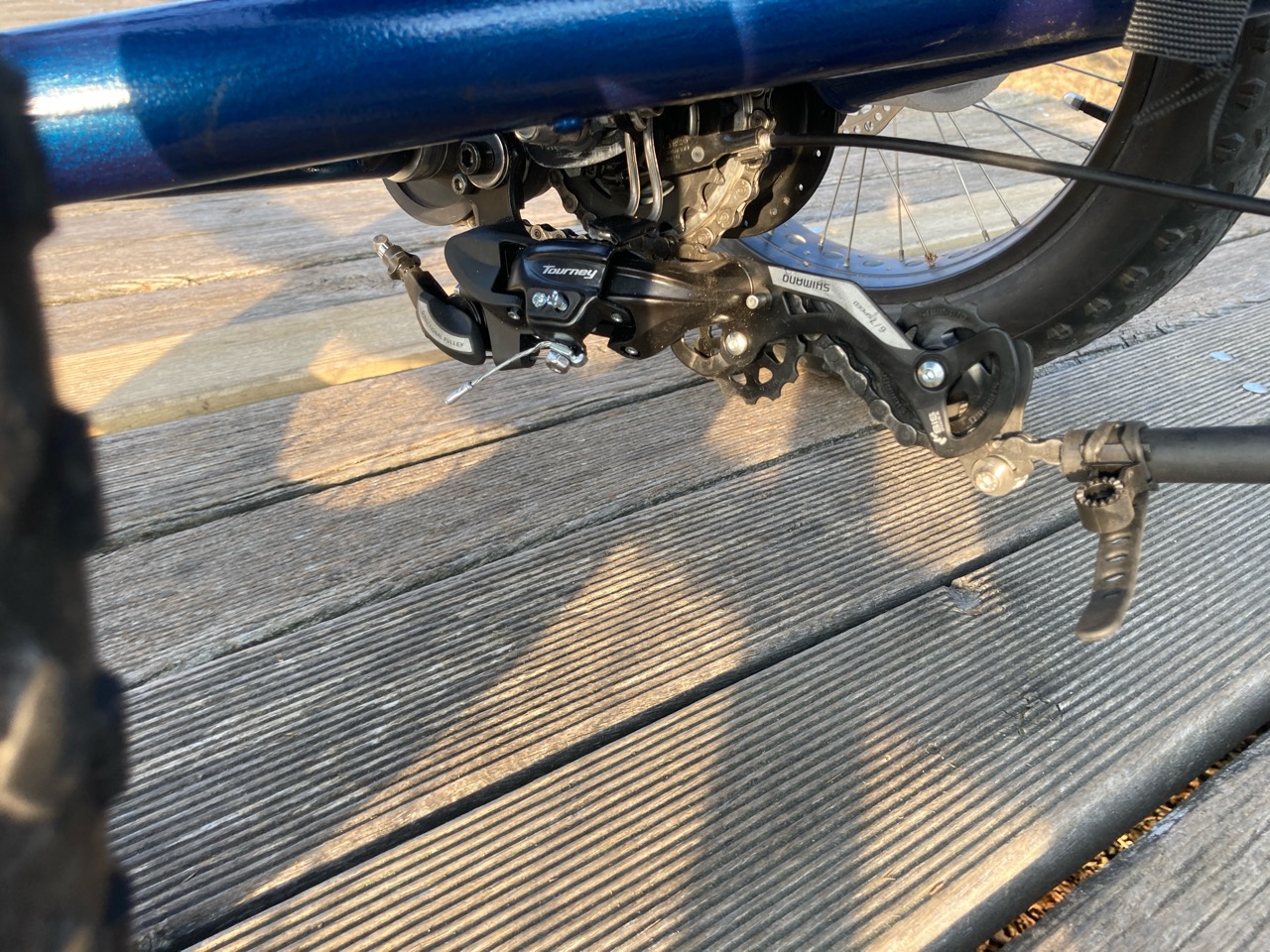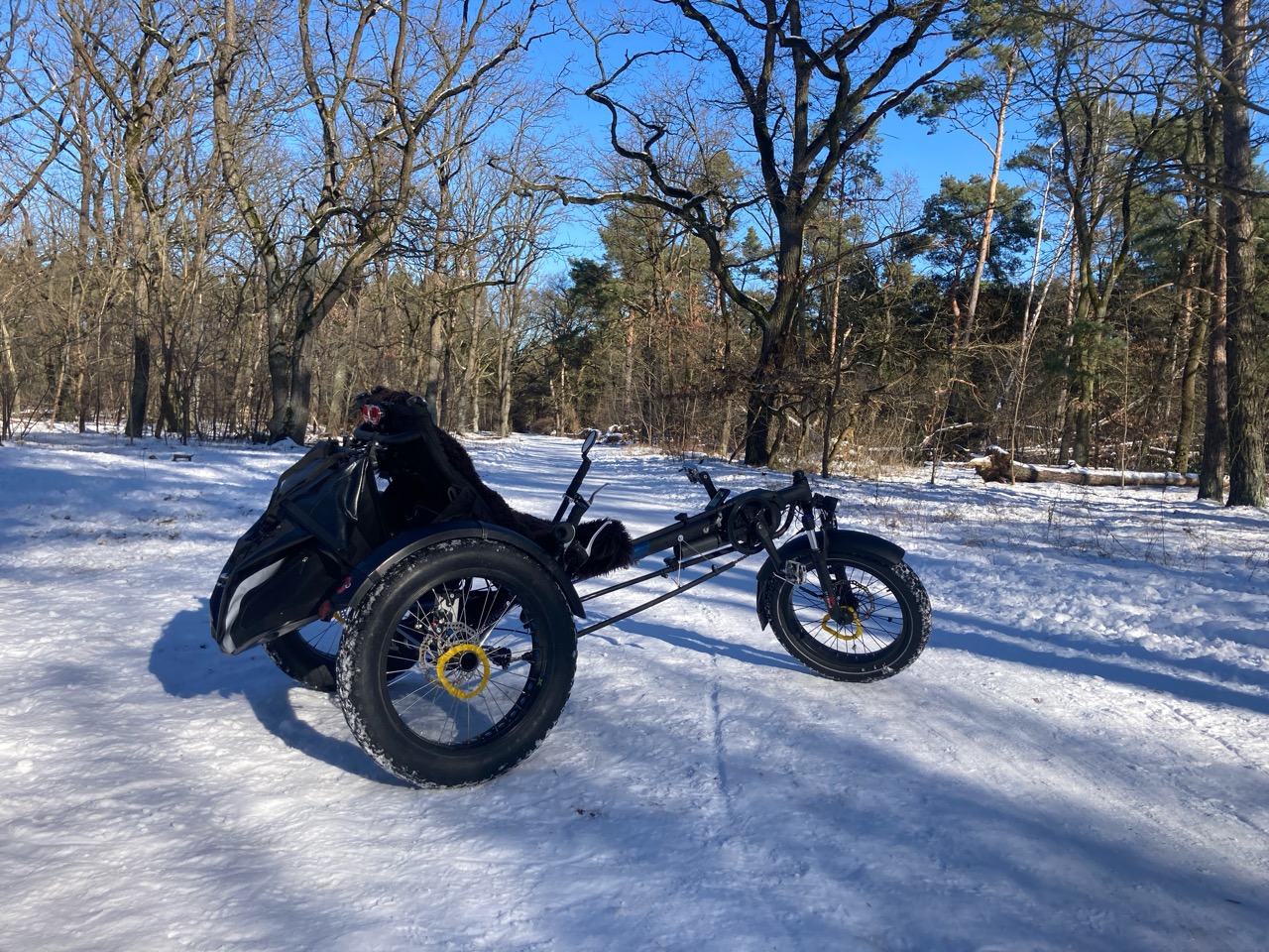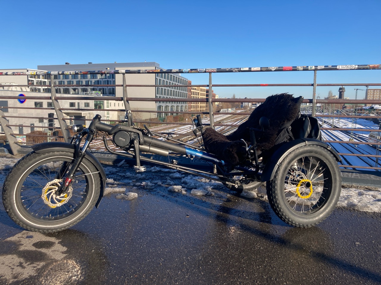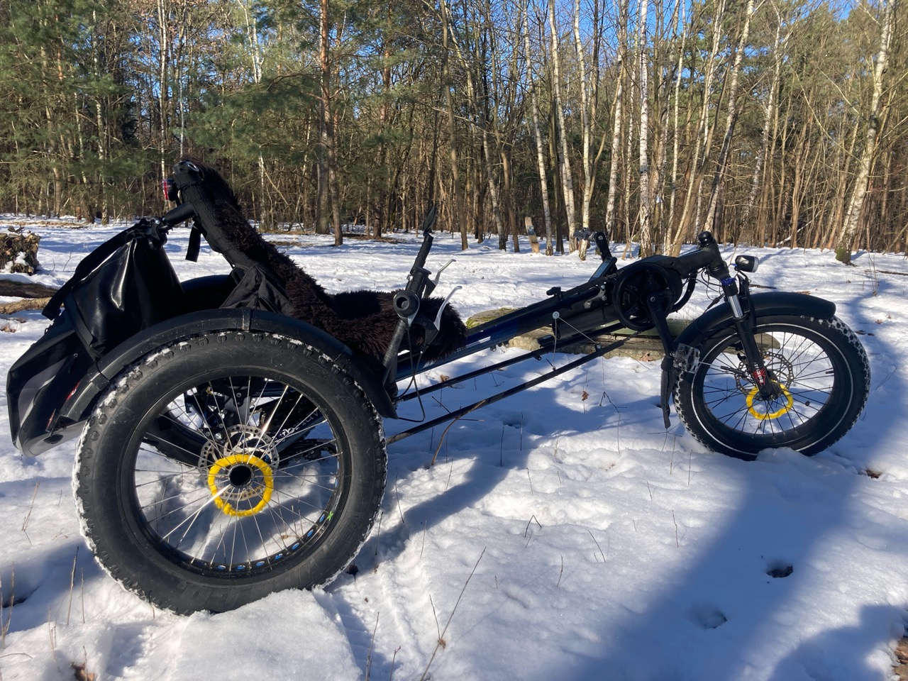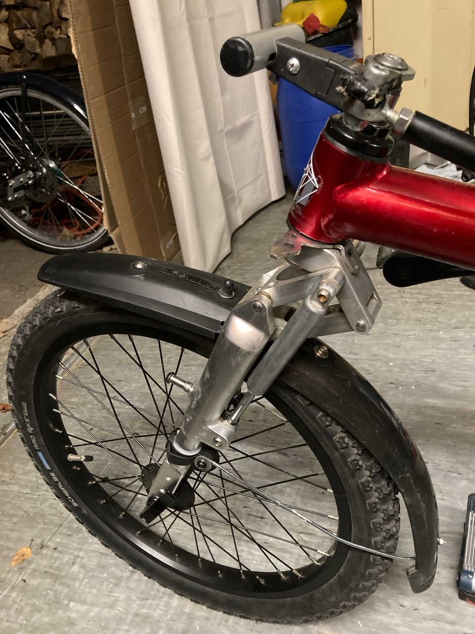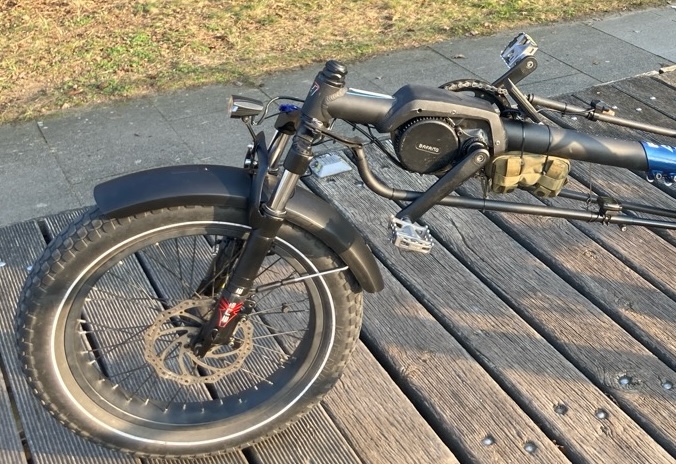 – Auf die breite Fatbike Felge vom Vorderrad wurde ein Schwalbe Big Apple 20×2,15″ aufgezogen. Es lenkt sich nun wieder viel leichter und ist in der Testphase.