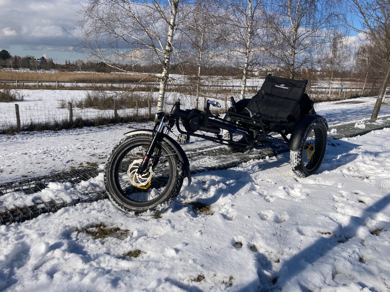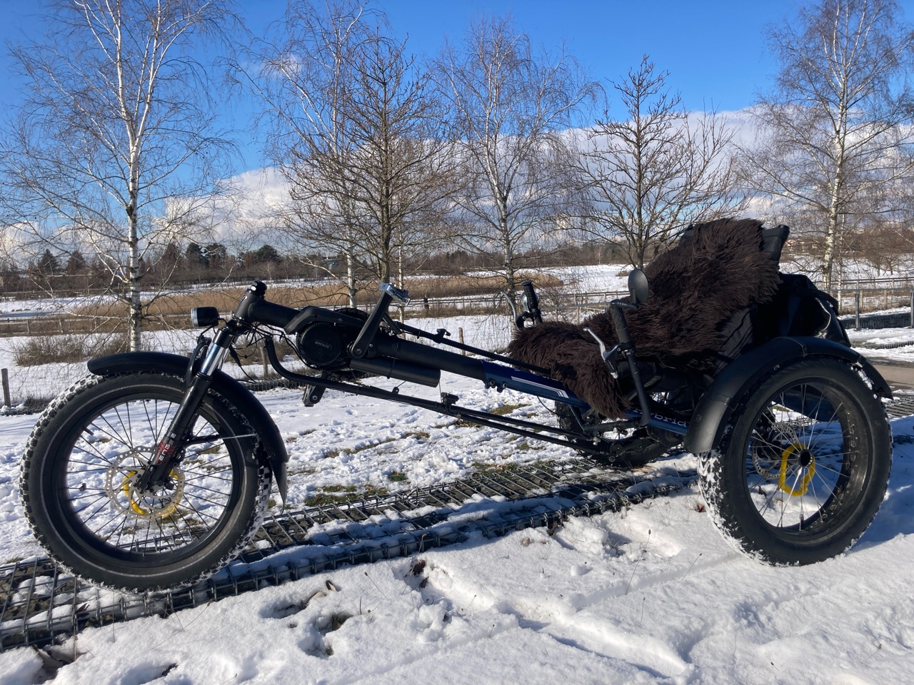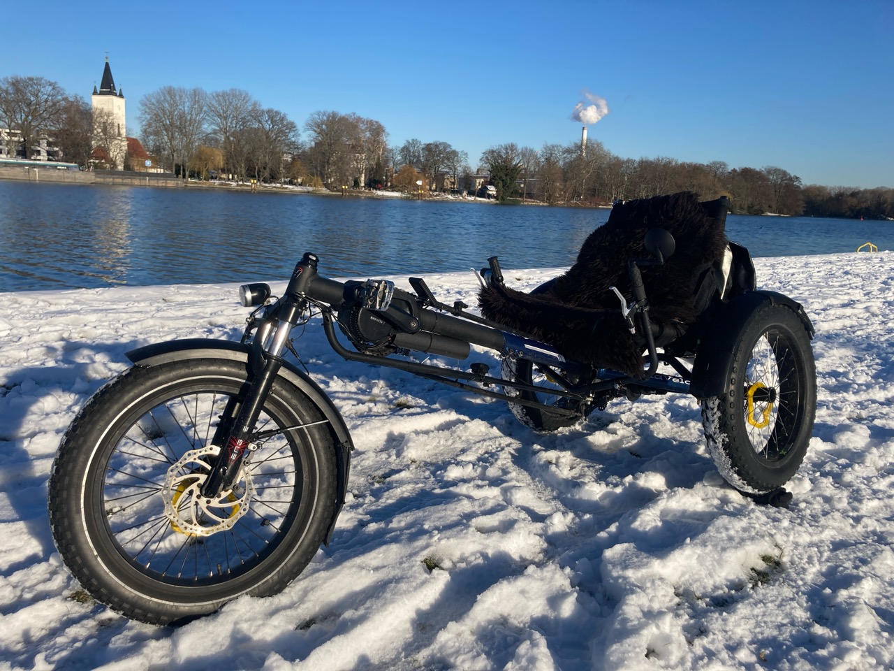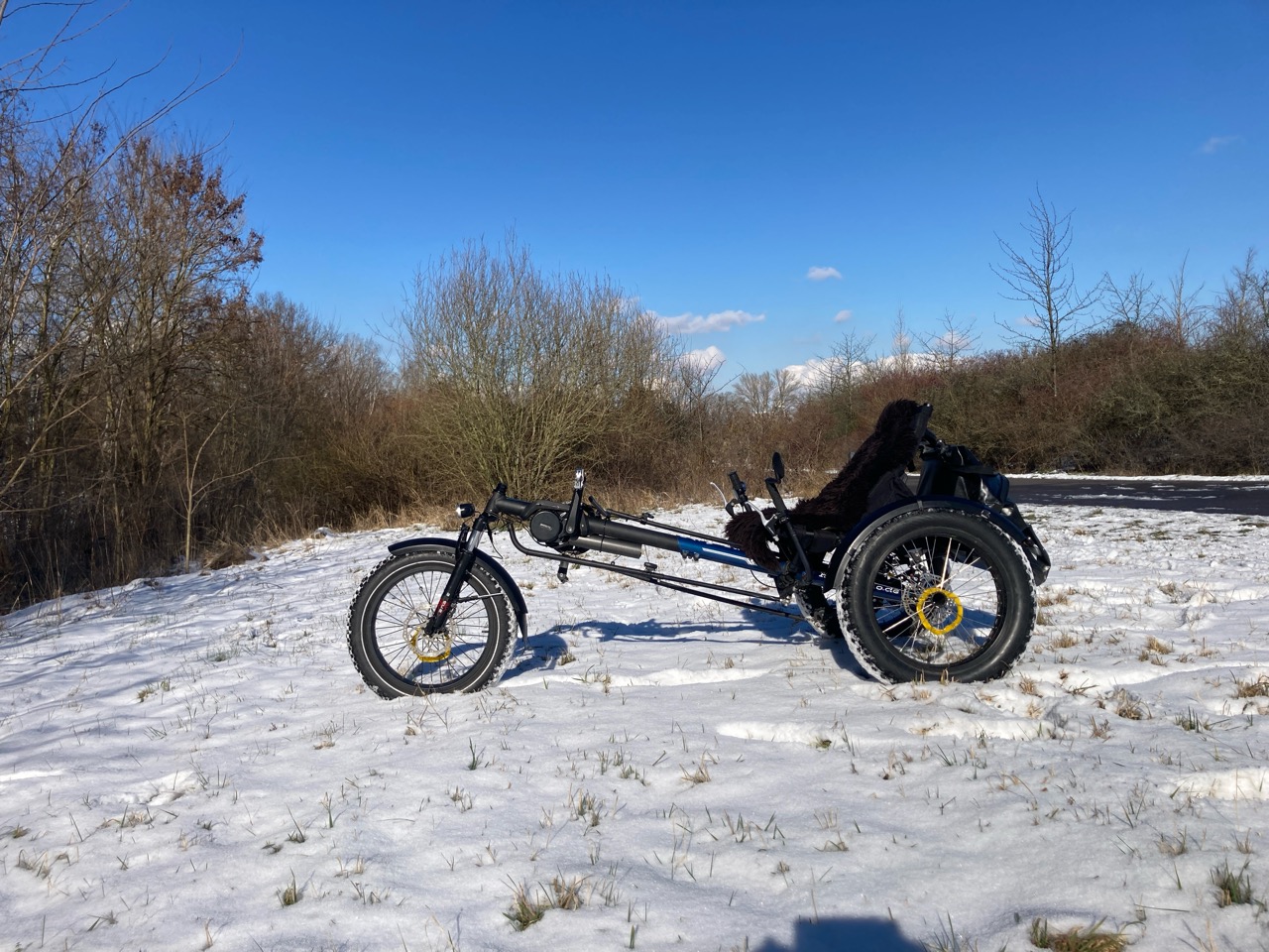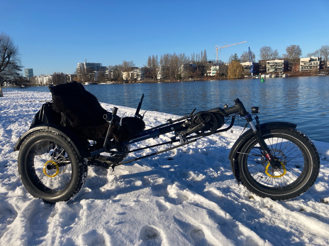 – Auf die breite Fatbike Felge vom Vorderrad wurde ein Schwalbe Big Apple 20×2,15″ aufgezogen. Es lenkt sich nun wieder viel leichter und ist in der Testphase.