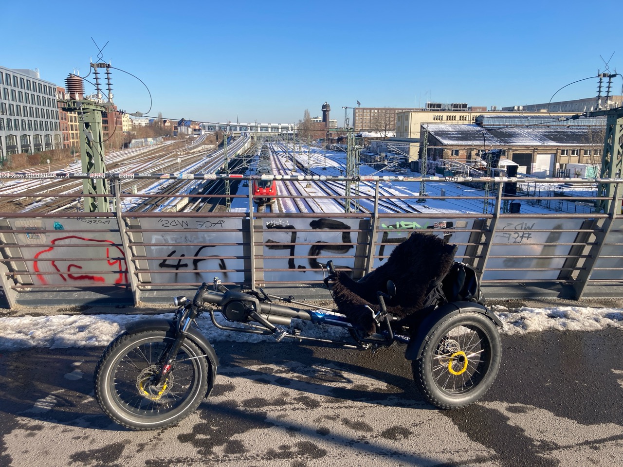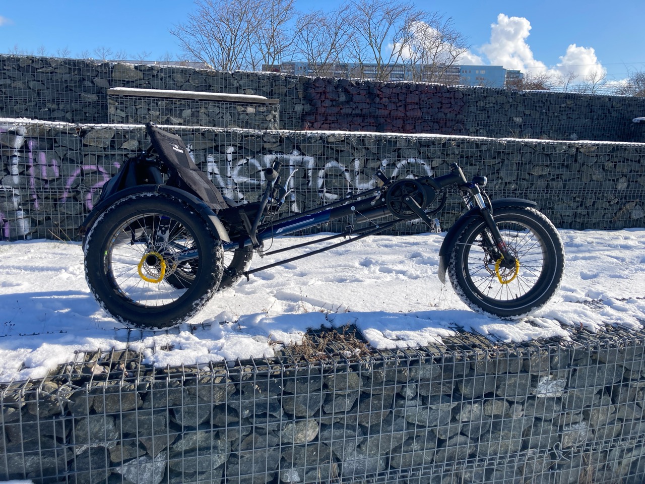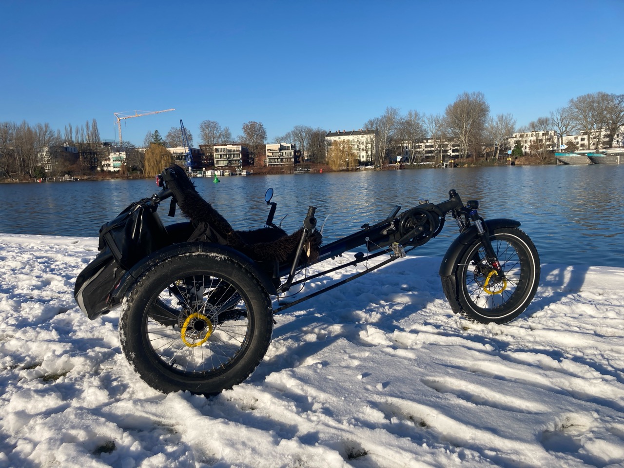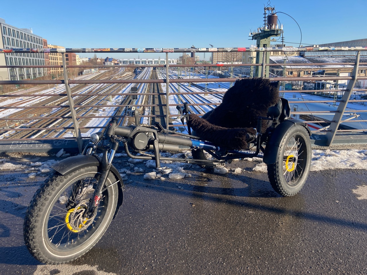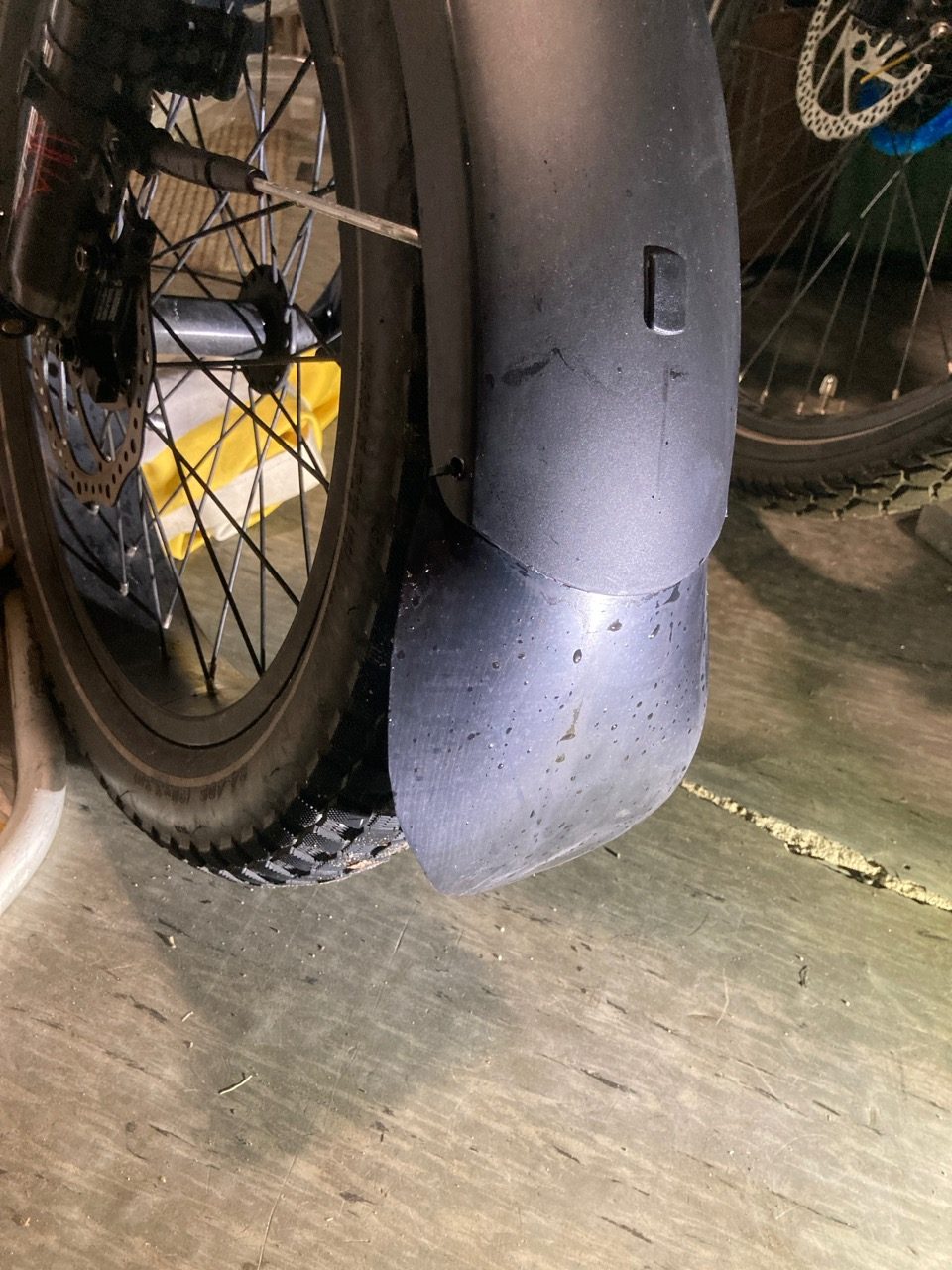 – Auf die breite Fatbike Felge vom Vorderrad wurde ein Schwalbe Big Apple 20×2,15″ aufgezogen. Es lenkt sich nun wieder viel leichter und ist in der Testphase.