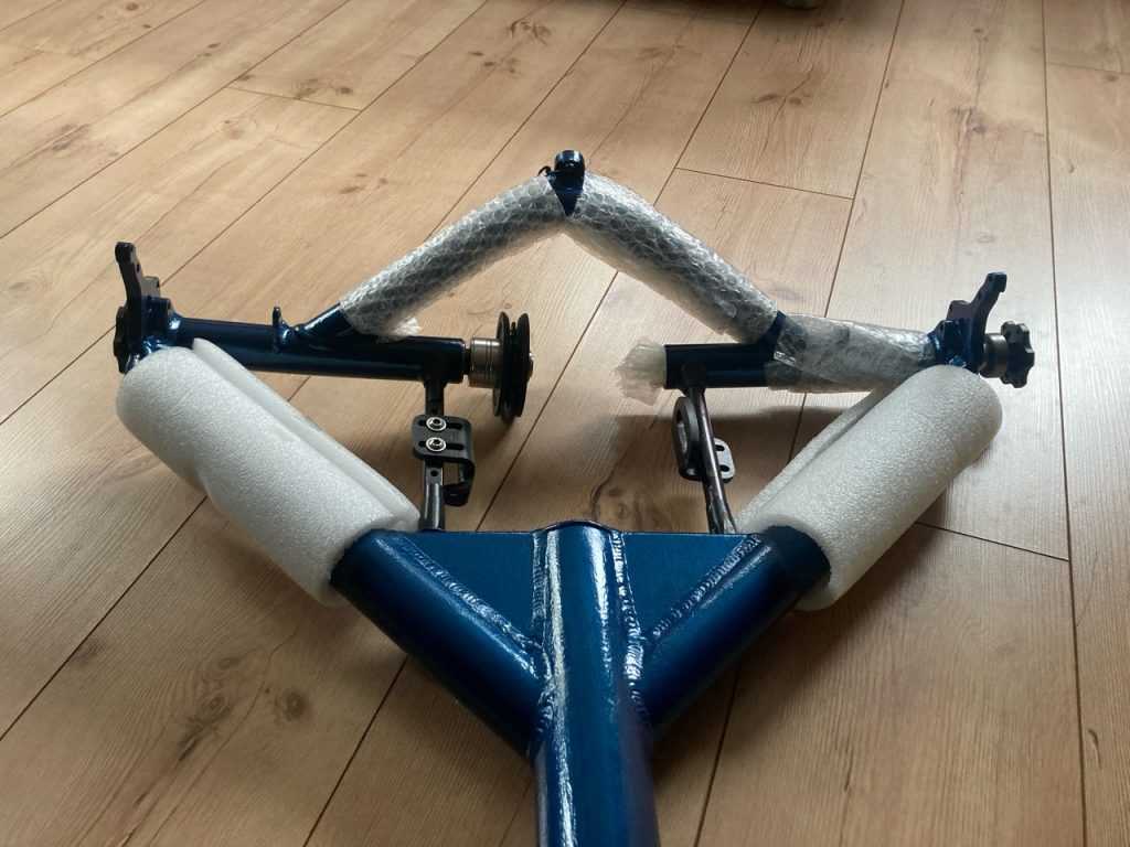 Der Rahmen hat gerade einen farblichen Zwilling bekommen. Ein Döschen Farbe reicht tatsächlich genau für zwei hintere Rahmenteile. Der Zweite bekommt morgen seinen letzten Anstrich und kann trocknen.
