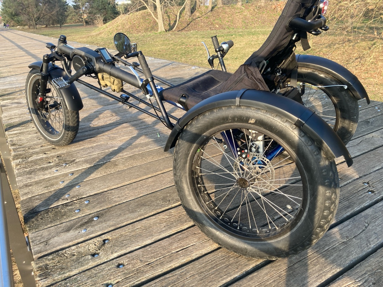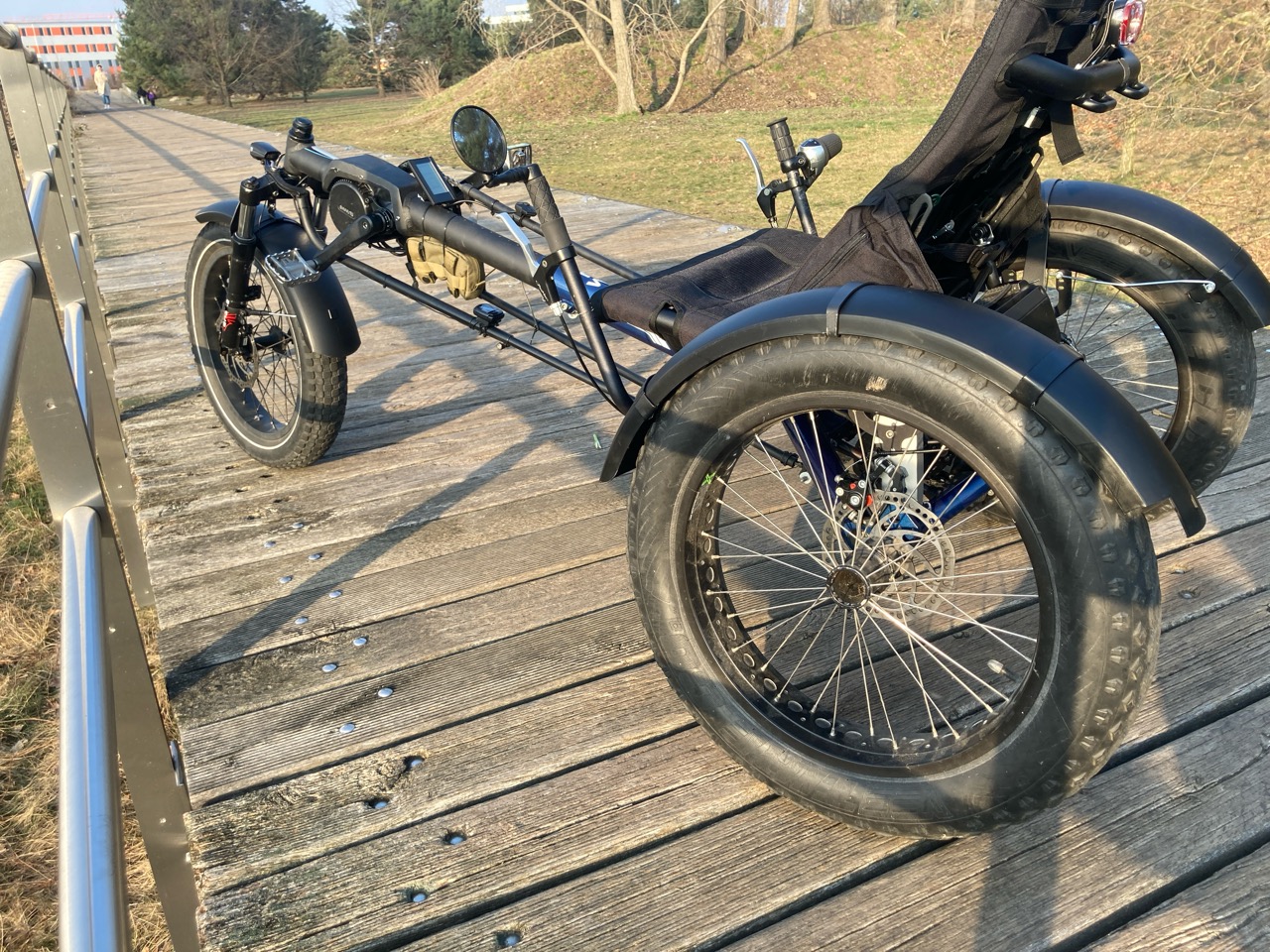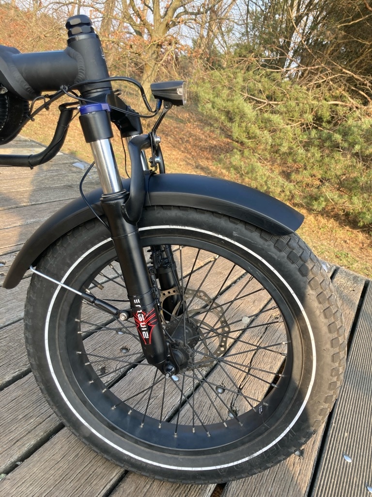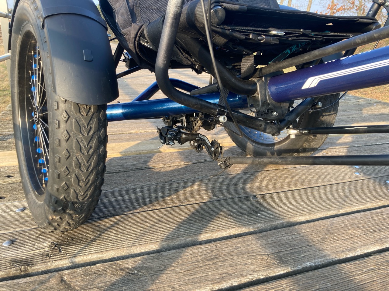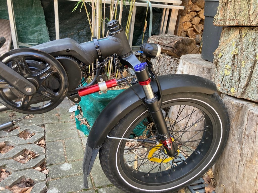 Bei diesem Aufbau wollte ich alle drei Räder in Fat. Das wiederum geht ja leider nur mit einer neuen Federgabel. Das Vorderrad ist etwas schmaler als die Hinterräder.