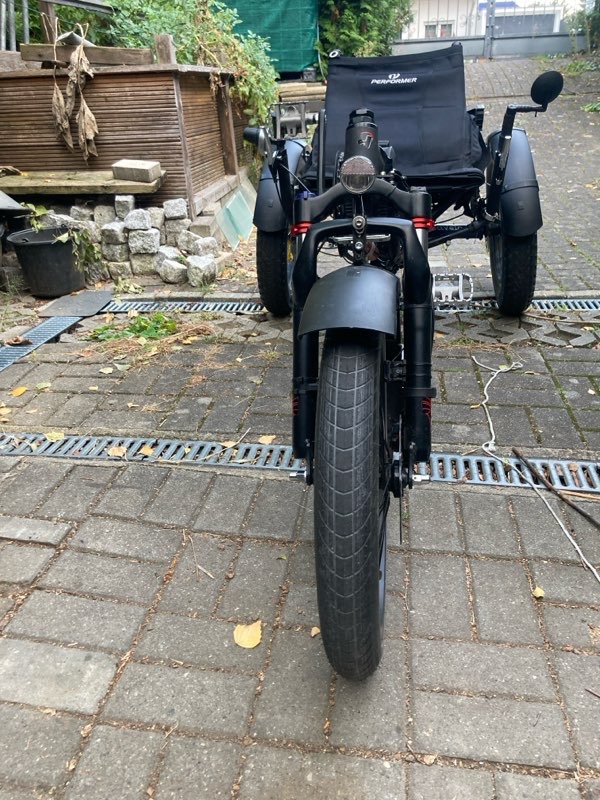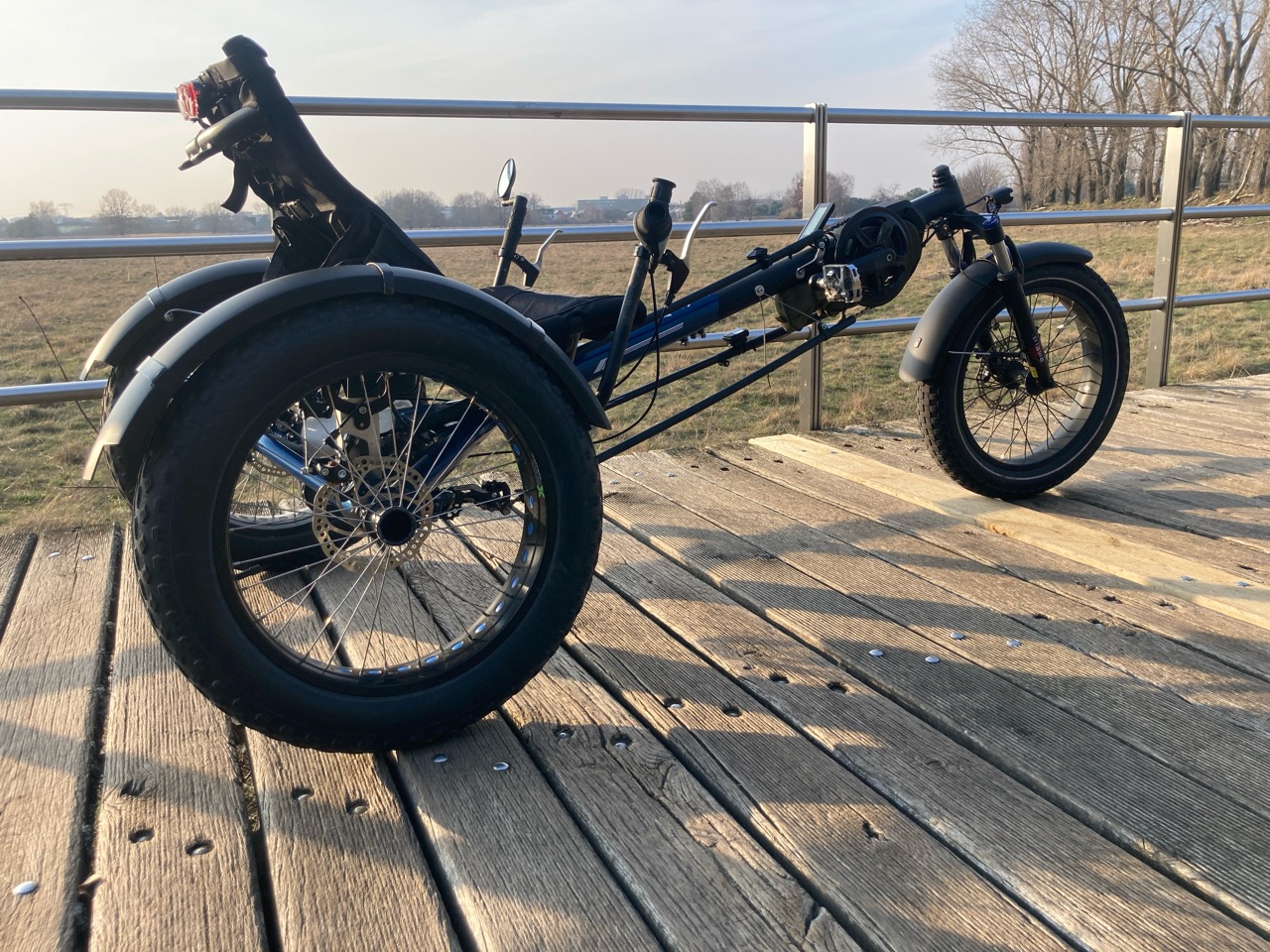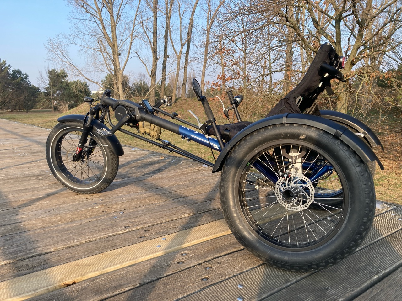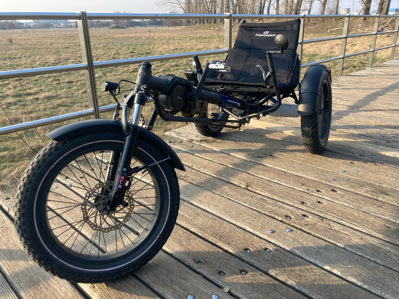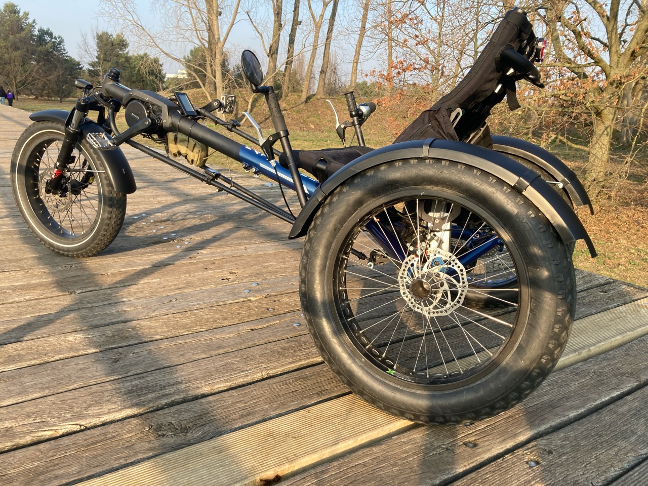 Bei diesem Aufbau wollte ich alle drei Räder in Fat. Das wiederum geht ja leider nur mit einer neuen Federgabel. Das Vorderrad ist etwas schmaler als die Hinterräder.