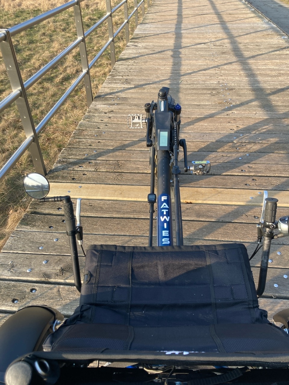 Durch den dicken Reifen vorn bekommt man Unebenheiten extrem in der Lenkung mit. Das war auch schon beim Fat-ICE so. Ich habe ja gehofft dass es die 26″ Reifen sind die das Fahren manchmal etwas nervös machen, aber es ist beim 20″ Reifen genauso. Auf glatter Piste rollt das Fatwiesel brav gerade aus ohne das sich ein Aufschaukeln bemerkbar macht. Aber kleine Buckel bekommt man extrem mit.
