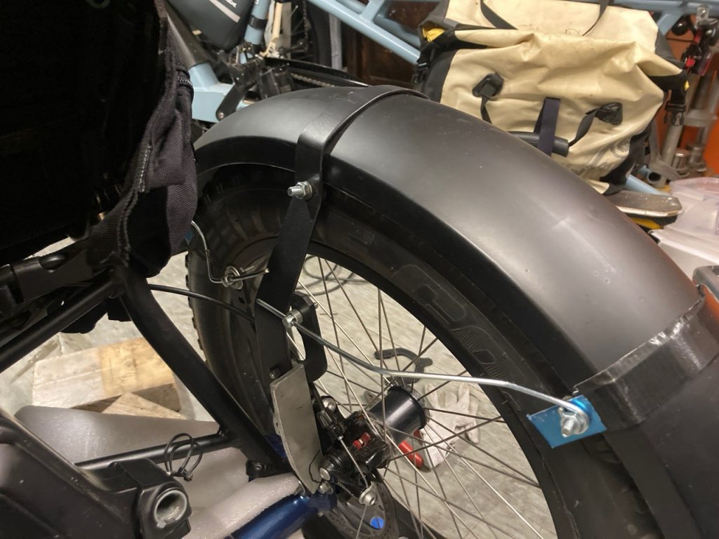 Die Gabel hat ihren Platz bekommen, dazu ein zweigeteiltes Schutzblech. Unter der Gabel ist nämlich nicht viel Platz.