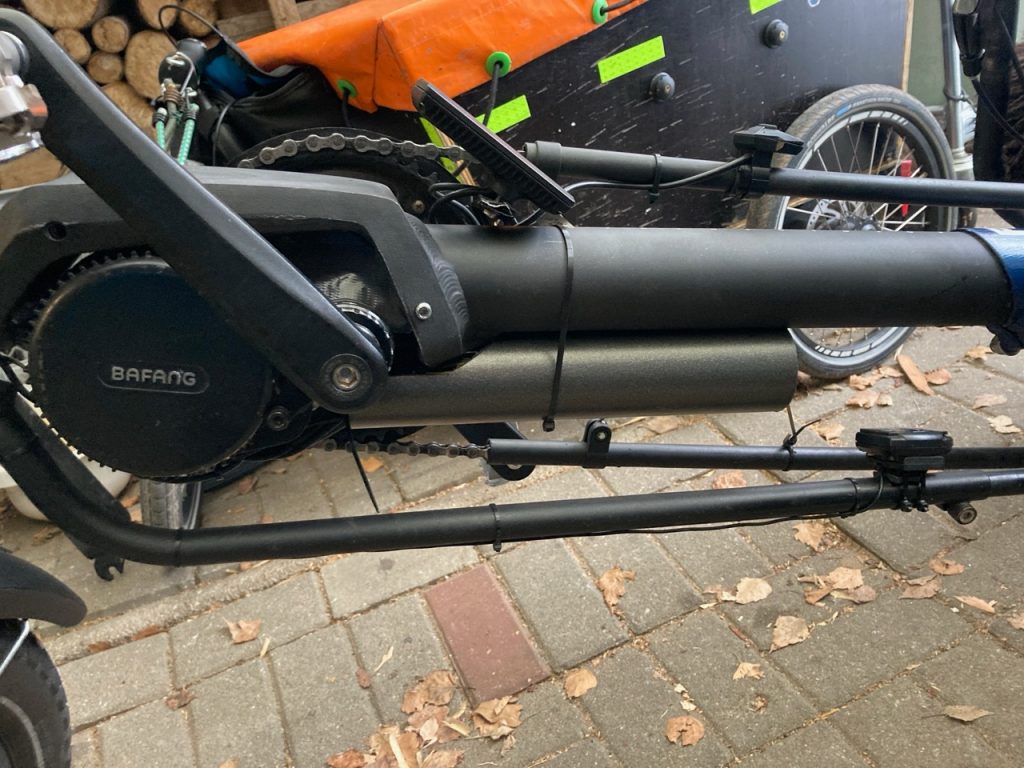 Es werkelt wieder der Bafang BBS01b im Fatwiesel. Der Mast stammt von einem Evo mit Shimano 6000-Motoraufnahme. Der Motor wurde wieder mittels eines Adapters in den Mast eingesetzt. Als Kabelbox wurde ein Fallrohr in Anthrazit verwendet, das noch gekürzt wird und einen passenden Halter auf der rechten Seite bekommt, damit der Kabelbinder verschwindet.