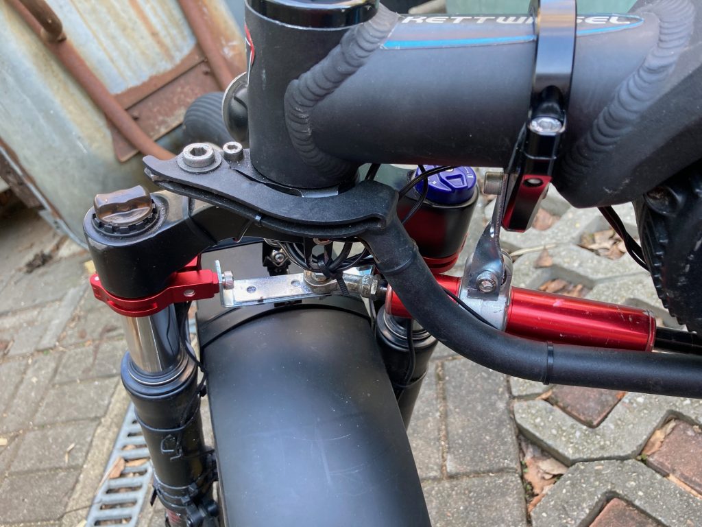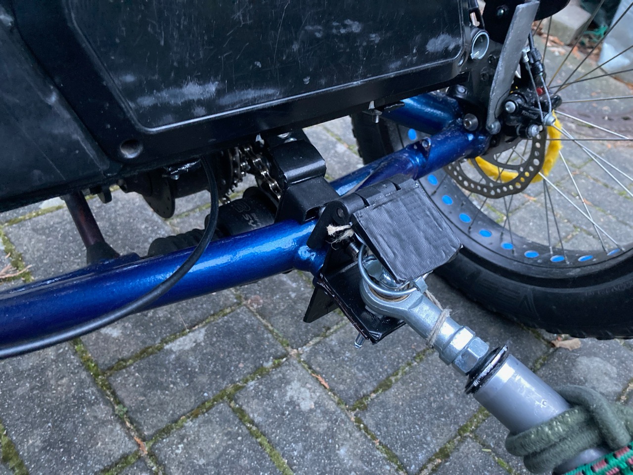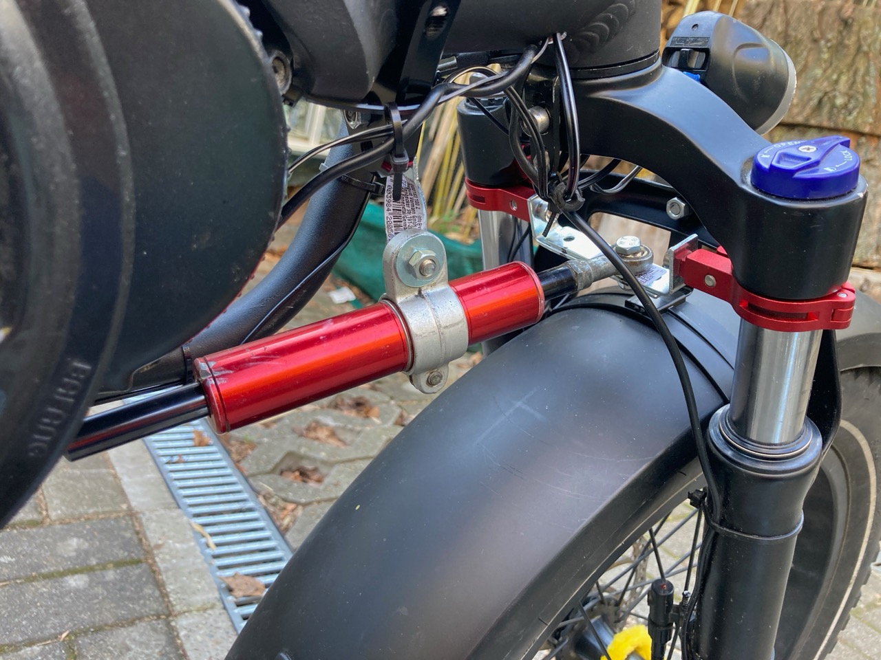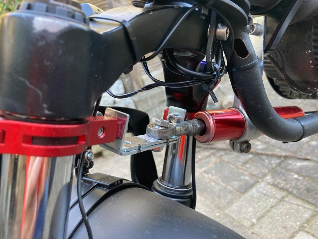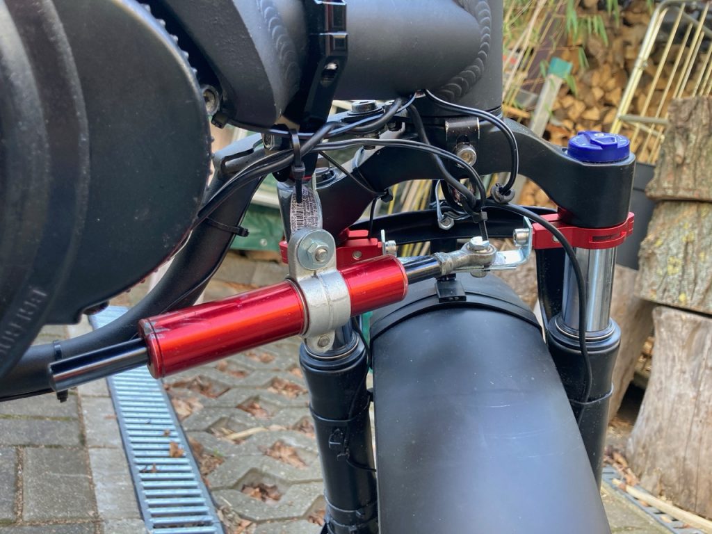 Die Anlenkung beim Wiesel ist ja immer so eine Sache. Im Original wird sie durch die gerade Lenkstange „untenrum“ auch gut realisiert. Will man später aber einen Bafang-Mittelmotor einbauen, steht man vor dem Problem, dass die Lenkstange nicht passt. Es gibt viele Wege – hier wurde der Weg mit einer Anlenkung „oberrum“ in Kombination mit einem Klemmvorbau gelöst. Das hat sich lange bewährt und funktioniert soweit auch gut. Zusätzlich ist dieser Weg bei diesem Wiesel auch der Gabel geschuldet. Diese lässt sich so auch nicht wirklich mit der originalen Lenkstange ansteuern. Für den Prototyp genau das Richtige.