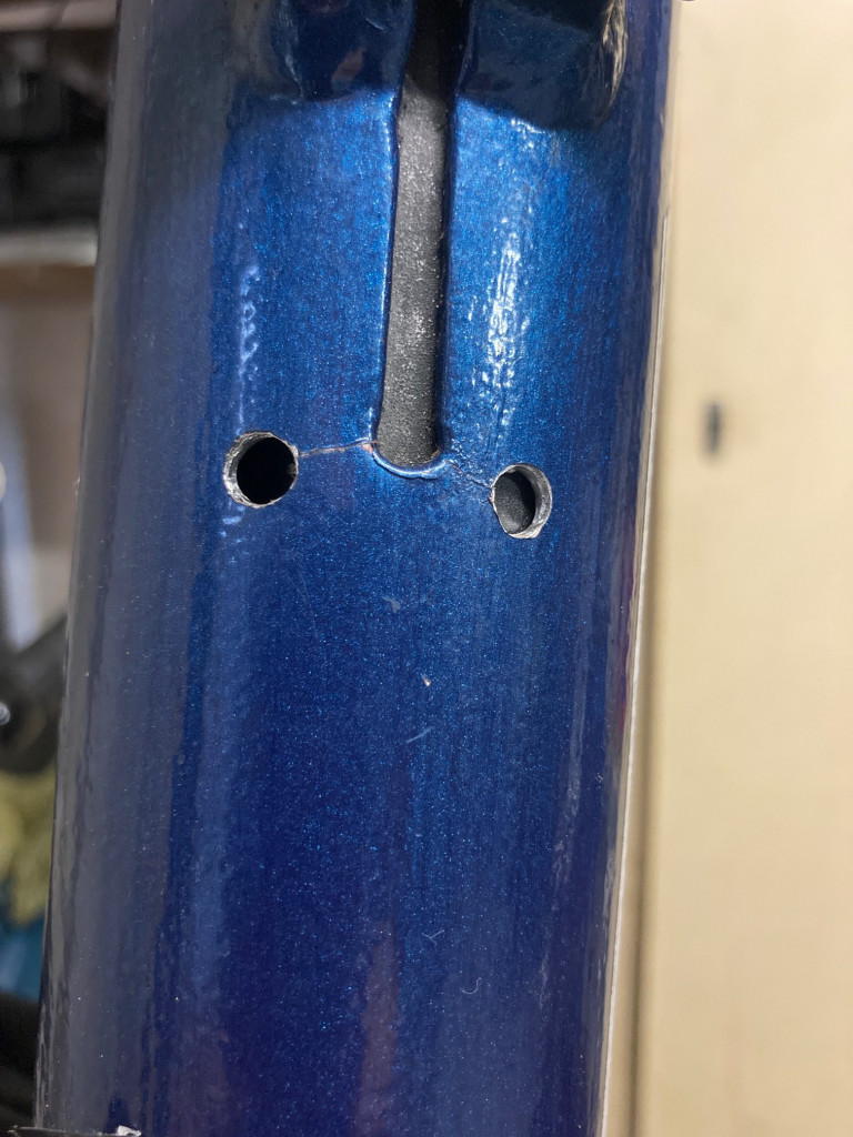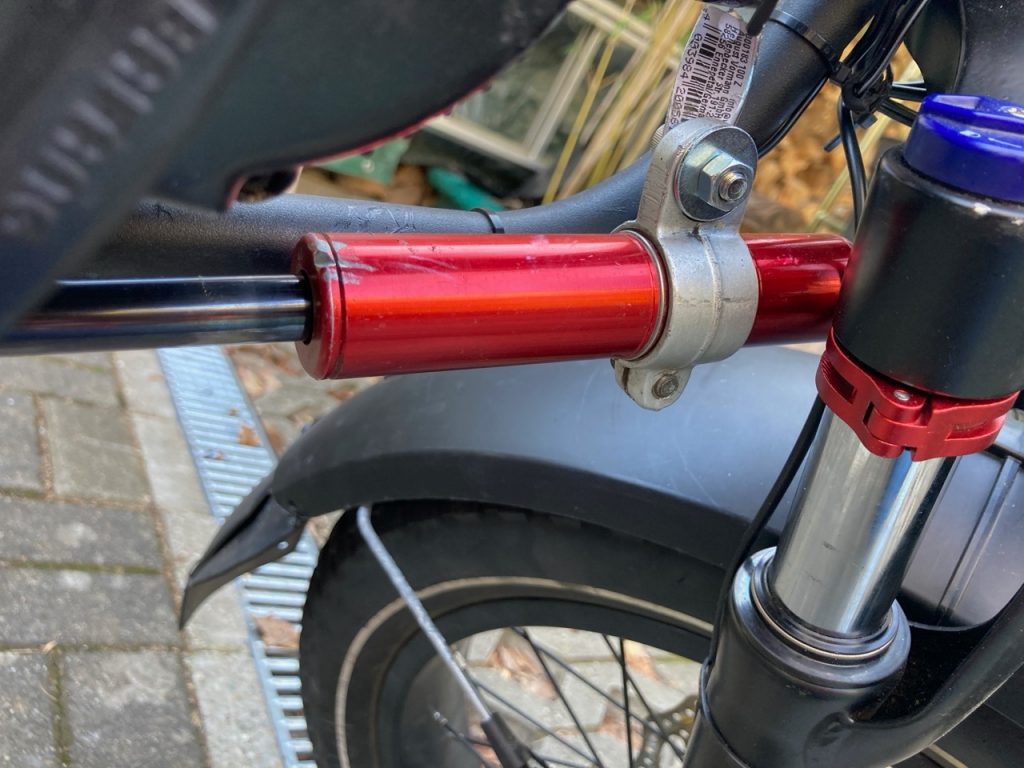 – Jetzt wo es sich so schön leicht wieder lenkt sind beim Basteln zwei entstehende Haarrisse an der Rahmenklemmung aufgefallen. Vielleicht wurden sie ja frühzeitig erkannt und können durch die zwei Hilfsbohrungen aufgehalten werden.